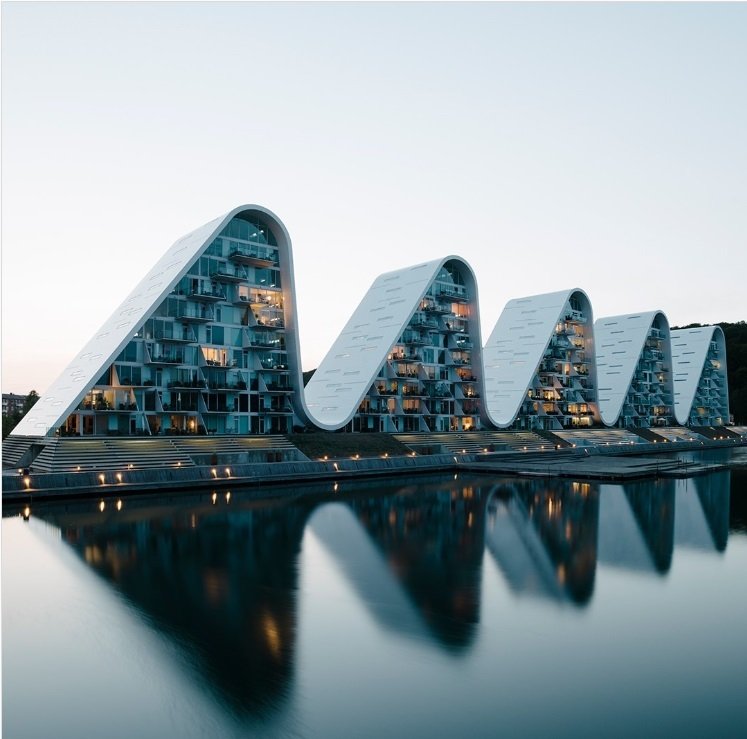 緩やかな白い「波(The Wave)」型の建物が、フィヨルドの風景と美しく馴染む。Dezeenの報道によると、着工したのは2006年だが2008年に金融危機により工事が一時中断。長年2棟のみが完成した状態だったという。2013年にHenning Larsen Architectsの代表であった建築家のヘニング・ラーセンが死去。その2年後の2015年にやっと工事が再開し、5棟が揃った形で2018年に完成した。