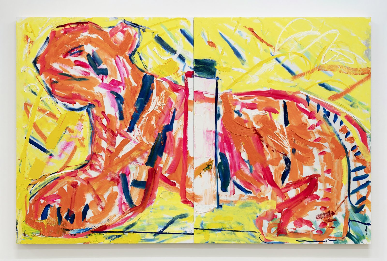高橋の変化のきっかけは一体何だろう…?そのひとつとして家族構成の変化、つまり子どもが生まれたことにあるという。それまでの高橋は芸術至上主義とも言うべく日々の制作に没頭。暗い夜中でも蛍光灯の下で厚塗りの絵画を描いていたが、生活と制作のバランスを取るため昼型の制作リズムとなり、これまでには取り上げなかった身の回りのものを薄塗りで描く作品へと転換していく。『WALKMAN』は愛用していたウォークマンを描き、『Toy(虎)』もリアルな虎ではなく、子どもが遊ぶレゴのおもちゃをモチーフとして一気に描きあげているのだ。