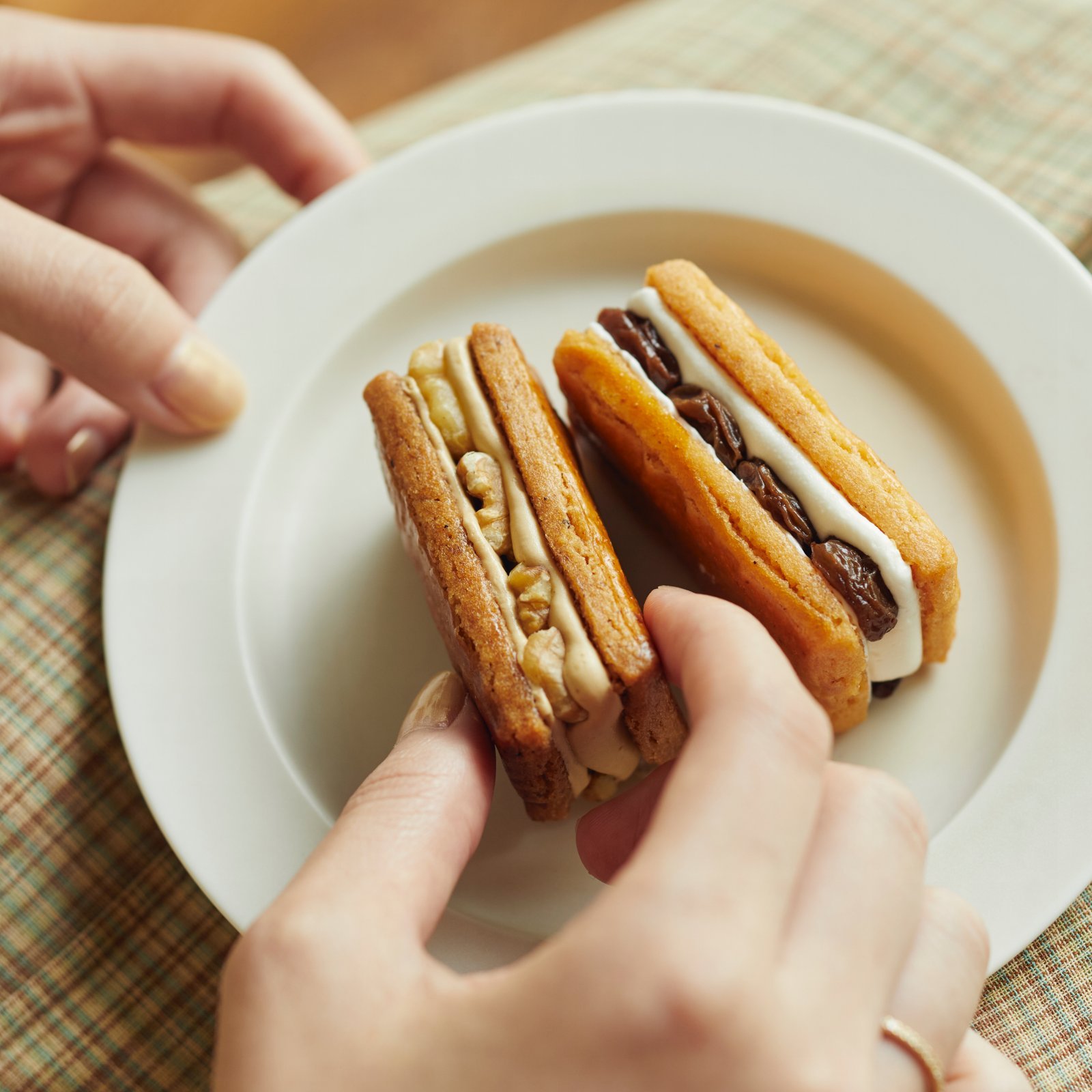 期間中は、パイナップルとココナッツを使ったトロピカルフレーバー「(NO) RAISIN SANDWICH ピニャコラーダパラダイス」と、新フレーバーのコーヒーとクルミの香ばしい秋味「(NO) RAISIN SANDWICH クルミコーヒー」を販売。クルミコーヒーは9月25日(日)のオンライン販売開始に先駆けての先行販売となる。また、(NO) RAISIN SANDWICHのオリジナルグッズも多数展開し、菓子だけでなく、お茶の時間そのものを彩るような商品が店頭に並ぶ。波佐見焼の菓子プレートやスタッフエプロンのほか、ビーズ刺繍作家Crepe.による「レーズンサンドブローチ」、アーティストHONGAMAの「レーズンサンドゴースト」など、人気作家が手がけた作品も限定発売する。