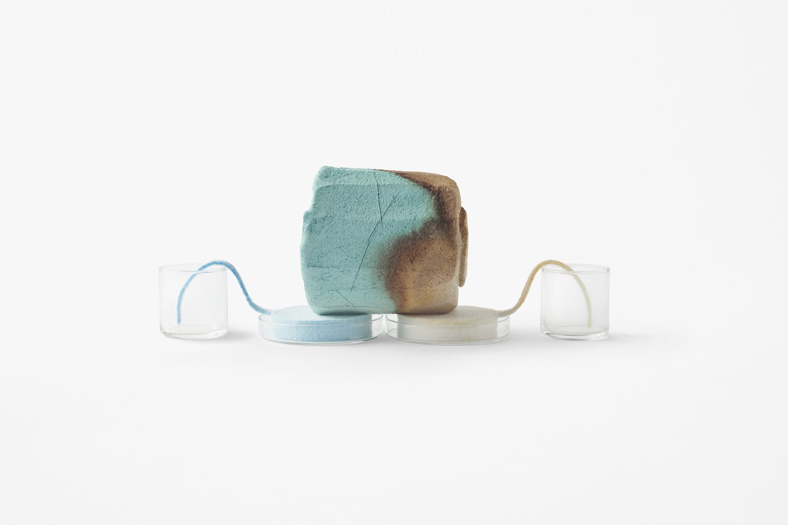 『NENDO SEES KYOTO』で展示されたのは、樂焼独自の軟質かつ多孔質な土質と肉厚な成形に着目し、焼成後の樂茶碗に赤ワインやコーヒーなどを高台から吸い込ませたもの。「器で飲む」のではなく、「器が飲む」ような様子。まるで、地下水脈が地質や地形に合わせて、その流れ方を変えながら大地を潤していく様を想起させることから「junwan(潤椀)」と名付けられた。今回、そのコンセプトをさらに発展させた「junwan-chroma-」は、水性の万年筆用インクを染み込ませ、色素の分離現象(=chromatography)によって内在する個性を現した茶碗。同じく「junwan-redox-」は、鉄、銅、銀の3種類の金属イオン水溶液と、ビタミンCを両側から染み込ませ、酸化還元反応(=redox)を起こしてから焼き上げたもの。そのほか、宙で回転することで時間の流れを表現する「chuwan」、5つの小さな空間を作り、茶碗から抽出したテクスチャ―を部分的にオブジェに移植した「jihada」、茶碗の内部空間を3Dスキャンしたデータをもとに透明アクリルで物質化した「michiwan」を展示。長い歴史を持つ樂茶碗を解剖したようなユニークな作品たちが、薄暗い空間に浮かび上がる。