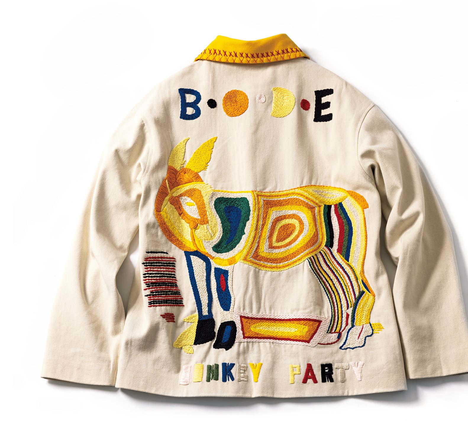 「ラルフ ローレンで経験を積んだデザイナー、エミリー・アダムス・ボーディが手がけるブランド。他の誰も掘り下げてこなかったアメリカのビーチカルチャーを吸い上げたり、このジャケットのようにメキシカンな要素を多く取り入れたデザインを展開したり。伝統的な手法を駆使して現代に蘇らせるセンスに優れたブランドです」。身幅の広いショート丈のブルゾンは、背面にロバをモチーフにしたハンドクラフトの刺繍入り。多彩な色づかいもこのブランドの特徴のひとつ。