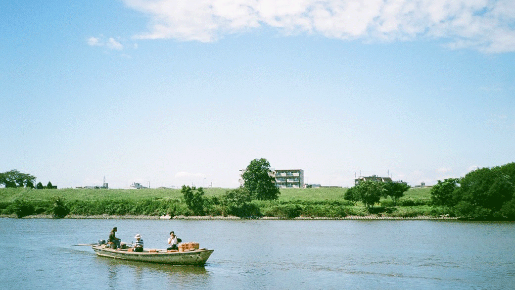 ゴルフ場を抜けると、乗船場所があります。すでに10数人の団体客が舟を待っています。近くの売店で焼きそばを仕込んでいた旦那さんに乗船方法を聞くと、チケットなどはなく、舟に乗り込んだ時に船頭さんに200円を払えば良いとのこと(映画『男はつらいよ』の第一作目では30円だった気がします)。川べりで待つこと約10分、舟が静かに到着します。
