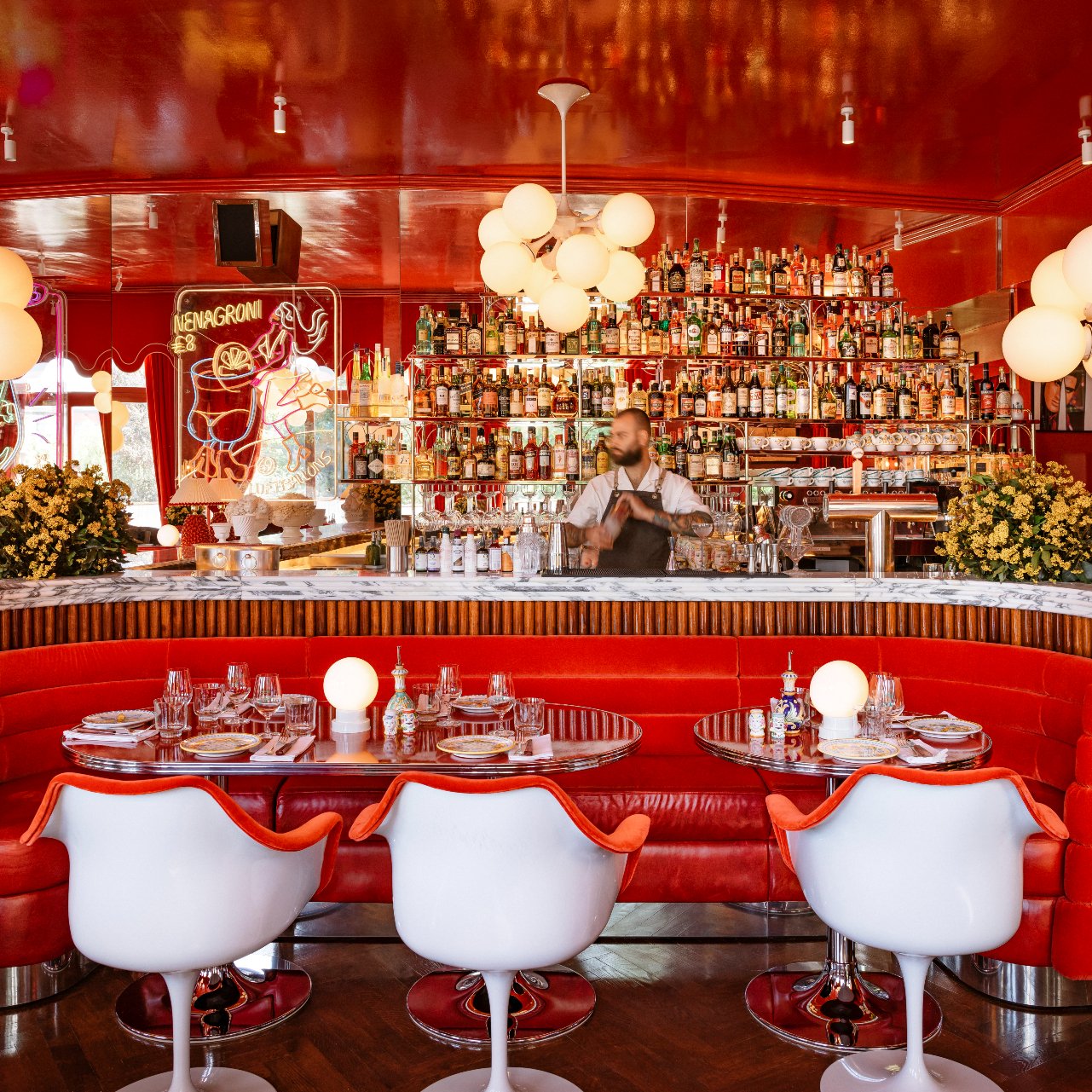 シックでモノトーンのインテリアが多いベルリンのレストランにおいて異彩を放つ真紅の内装は、イタリアの劇場をイメージしたもの。天井から壁、家具に至るまで赤で統一したなかにネオン広告やポップな家具が配置され、店内すべてが絵になる。200席もの店内はオープン以来、連日満席。SNS上に写真があふれ、人気に拍車がかかっている。