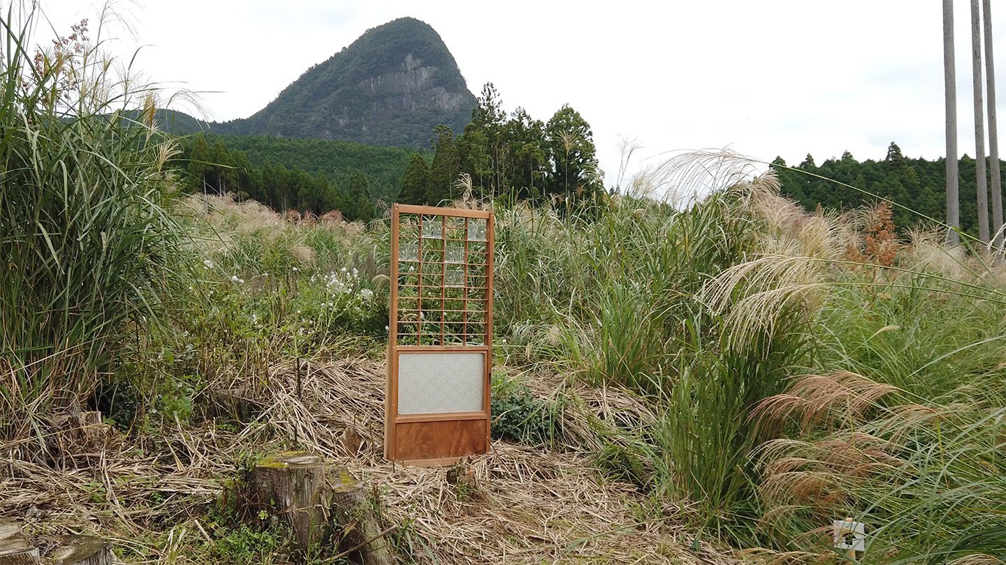 坂道を上り、MIND TRAILの矢印の表示に従って草原に向かうと、冒頭でも紹介した前田エマのインスタレーション作品『窓』と出会う。窓や鏡などを通して曽爾村の景色、生活を再発見することを企図したこの作品には、曽爾の人々が暮らしの中で実際に使用したものを利用。壮大な自然の風景に人々の生活と歴史が溶け込み、幻想的なイメージとなって展開する。川沿いに進む山道に入ると、草木を写す長岡綾子の『Mirrors for Weeds』や、尾柳佳枝の『外に囲まれている絵』という空間に呼応した作品が景色を彩る。