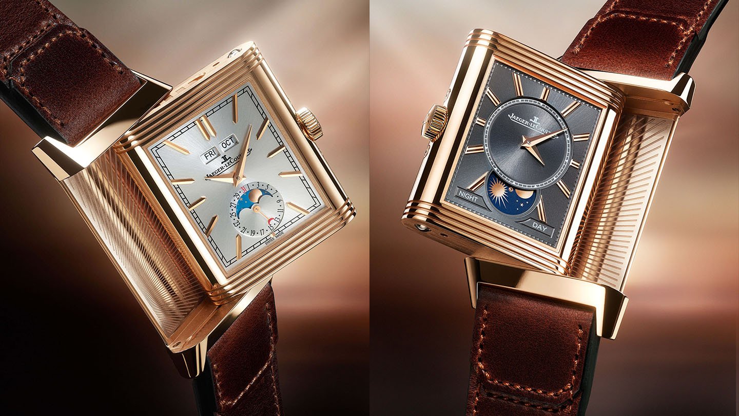 時計の表側と裏側にダイヤルがあり、腕につけたままで反転できるジャガー・ルクルト「レベルソ・トリビュート・デュオ・カレンダー」がリニューアルされた。表側は曜日と月を表示する2つの小窓があり、6時位置にはポインター式の日付とムーンフェイズを配置。裏側の時分計は第2時間帯となるため、昼夜表示(デイ&ナイト)も備えている。これらを1つのムーブメントで駆動する複雑時計だが、基本的なデザインは1931年に誕生したオリジナルを継承。当時のデザイン潮流だったアールデコの精神とスタイルを守り続けてきた。