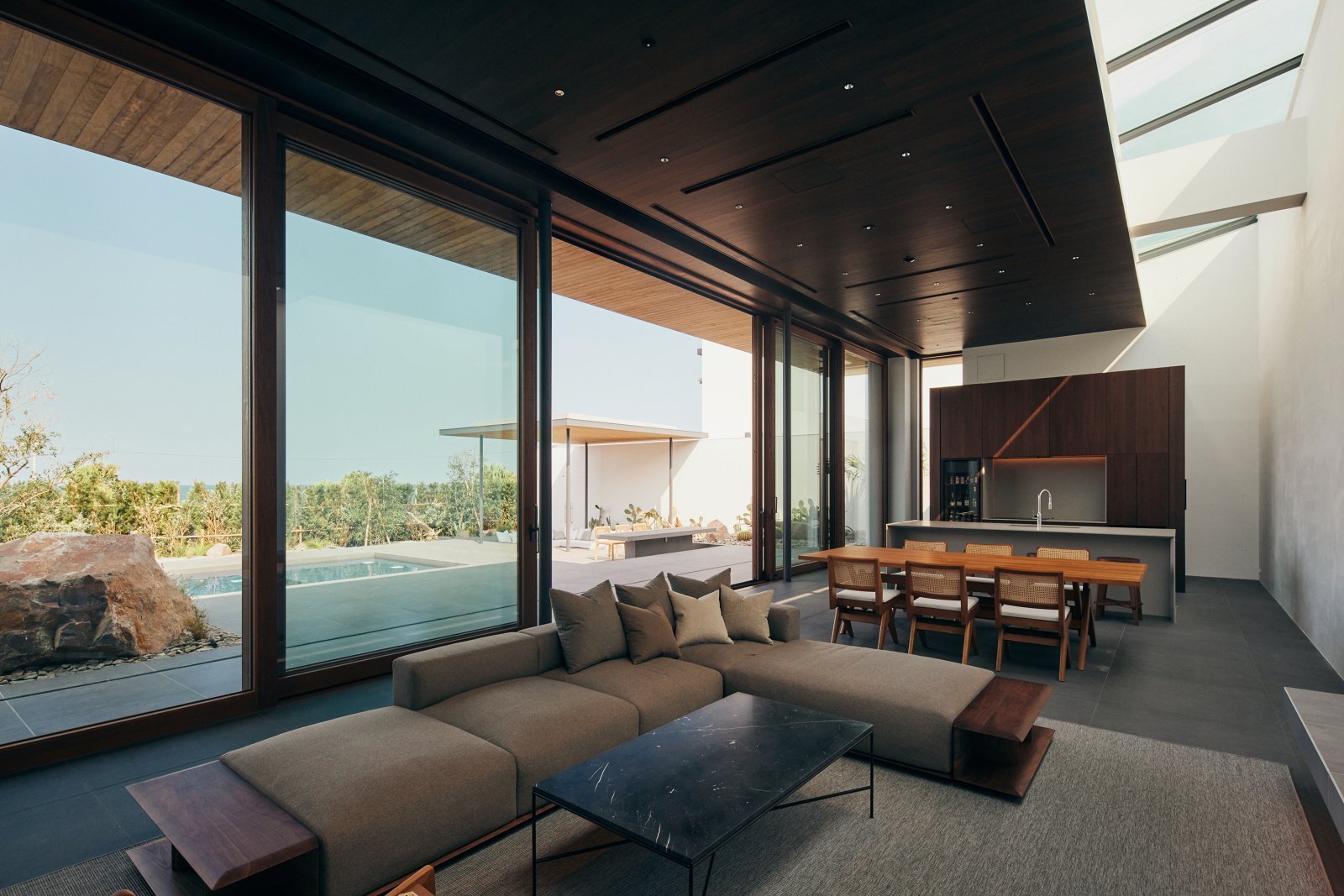 リビングから全長15メートルのプールを眺めると、インフィニティープール越しに海と広々とした空が眼前に。プライベート感あるビーチの空気を堪能できる。