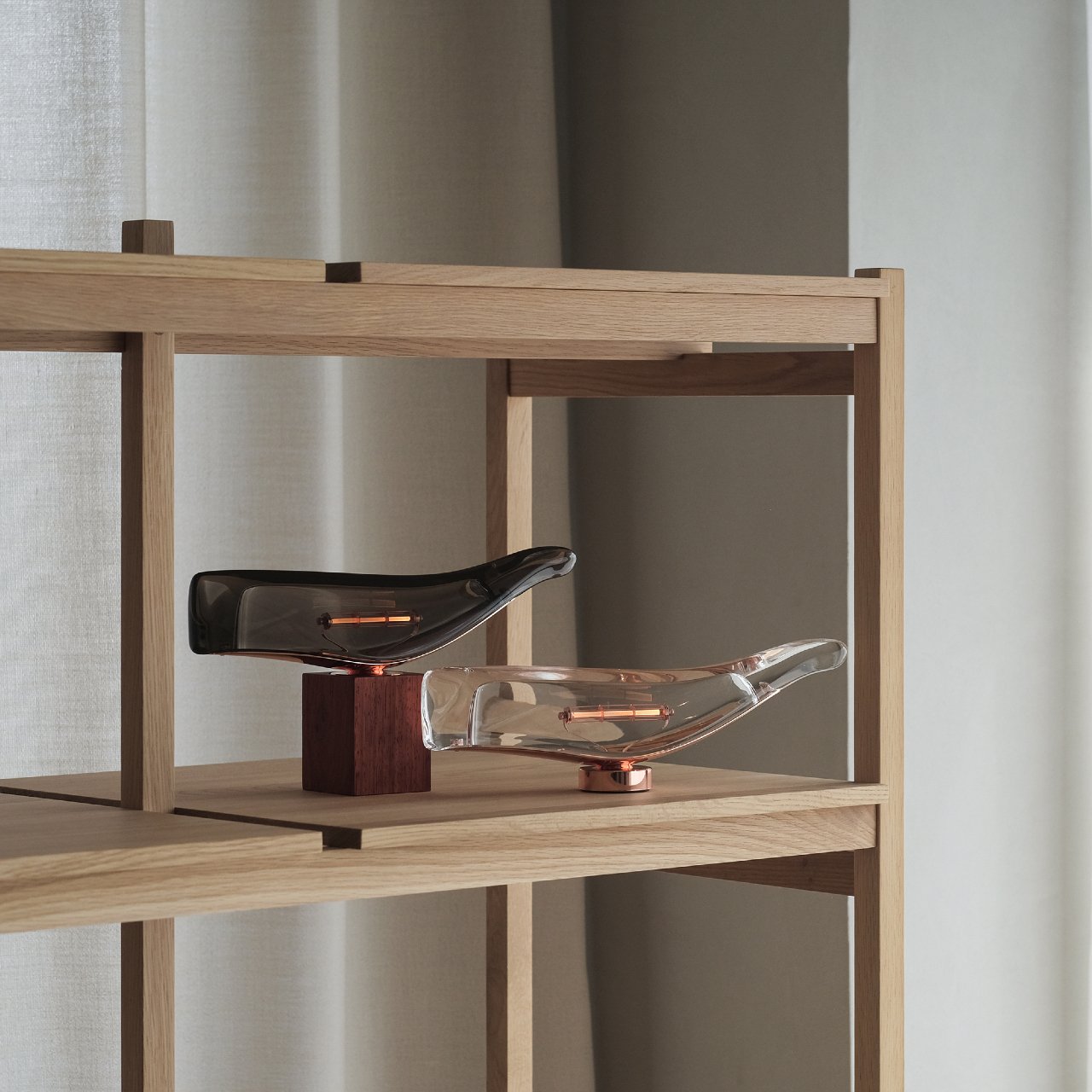 透き通ったマッコウクジラの姿は純度の高いアクリルで実現され、その内側で優しく灯るのはカシャロのために開発された筒状のLED光源だ。繊細なフレームを構造体とし、自然界の生命を感じさせる光となって空間に浮かび上がる。あかりを灯さない日中にも日差しを受けて自然な光をまとい、インテリアオブジェとなって暮らしに豊かさをもたらす。