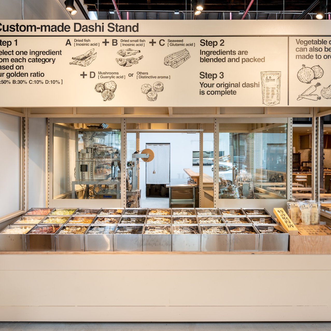 カツオやマグロなどの節や、昆布やシイタケなど20種以上の材料が並ぶダシスタンド。「NYブレンド」(15袋/26ドル)を用意。 Photo: GIONブルックリンのグリーンポイントに日本のクラフツマンシップを伝える「50 Norman」がオープン。海外初出店となる「CIBONE Brooklyn」をはじめ、1871年創業の水産加工卸の尾粂(おくめ)による出汁ブランド「DASHI OKUME」、ジャパニーズフレンチを供する西麻布発の「HOUSE」が共存するミニマーケットプレイス。