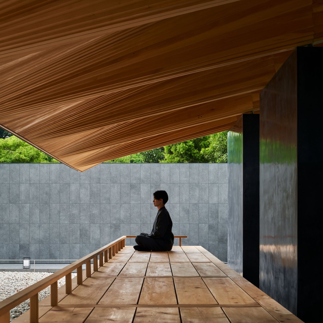 それらが特に表れているのが屋根の形状だ。静心所では祈りを導くかたちとして、イチョウの葉が頭上を大きく包み込むような面屋根をデザイン。倒木の恐れからやむなく伐採されたイチョウを構造材として活用しながら、柱のない軒下空間を実現した。板間に座ると御神木や社殿、授与所越しに五重塔までが望め、静寂の中で祈りを捧げることができる。
