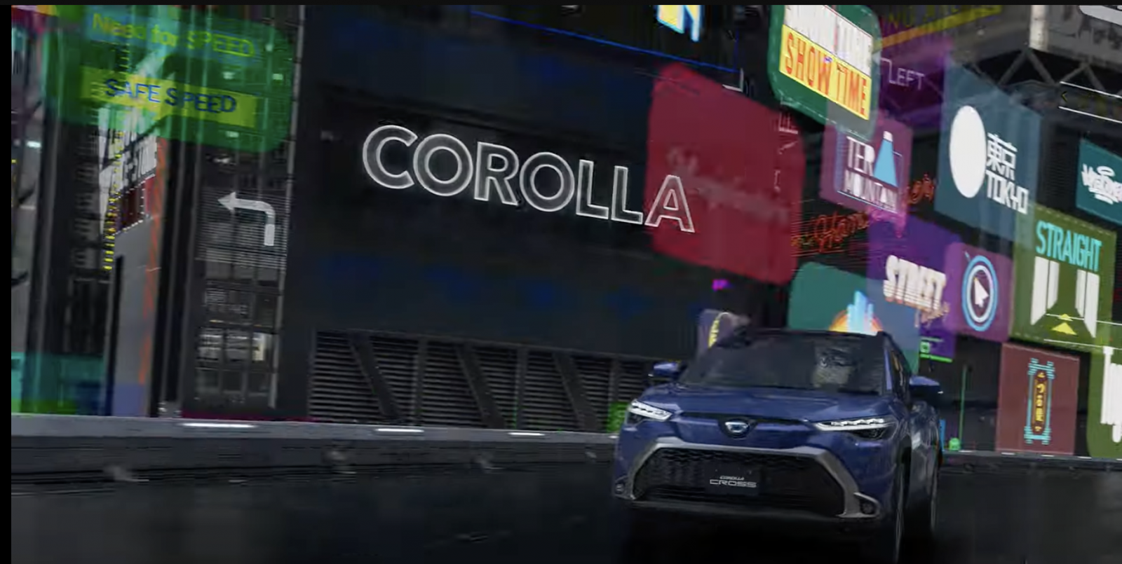 メタバース空間の未来都市。軽快なラップミュージックに乗せて、トヨタ自動車の「カローラ」が5台並んで走る。アバターで賑わう街やホログラムの看板が並ぶ道路を走り、最後はビルの谷間の光に向かって走っていく……。10月3日から放送された、カローラシリーズの「メタバース」篇だ。