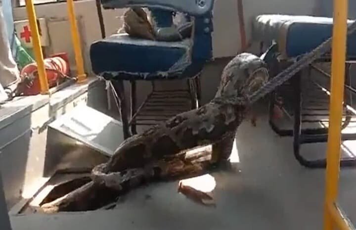 最も安全であるべきはずのスクールバスに、最も出会いたくない部類の動物であるニシキヘビが出現した。