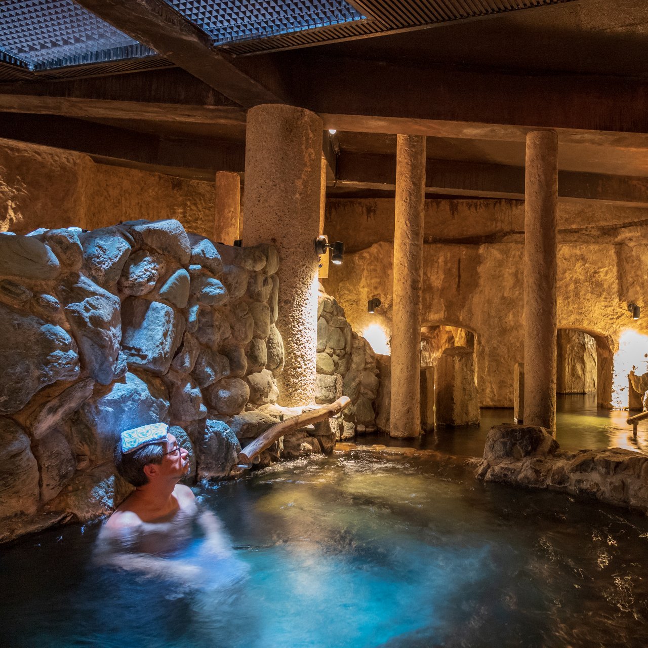 この風呂が抜群に心地よいのだ。源泉の湯温は34.5℃。低めで肌に優しいアルカリ性単純泉だから、いつまでも入っていられる。絶え間なく流れ出る湯量は毎分500ℓ。これだけ大量の湯が流れ込むせいか、不思議なほどに風呂は澄んでいる。底に敷き詰められた玉砂利を手ですくい上げても湯垢は見えず、サラサラしていて気持ちがいい。湯に身体を浮かせ、川をさかのぼるように洞窟の奥へ進む。薄暗い空間に響き渡る湯の音が、心の垢を砕くのがわかる。金婚式を迎えた老夫婦がここで後の人生を語り合う……金井社長はそう定義してこの洞窟風呂を設計したという。