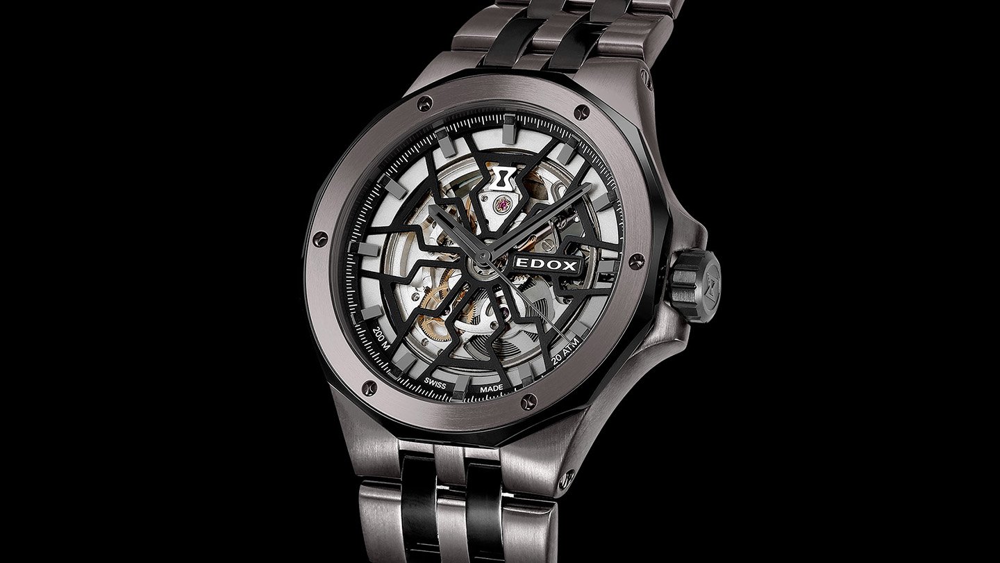 ちなみに、このカットワークはエドックスのロゴである“砂時計”を再解釈してデザインされたという。その向こうにある機械式ムーブメントも、テンプの往復振動を見やすくするだけでなく、ゼンマイの動きが分かるように香箱の蓋をカットするなど、繊細な工夫が施されている。