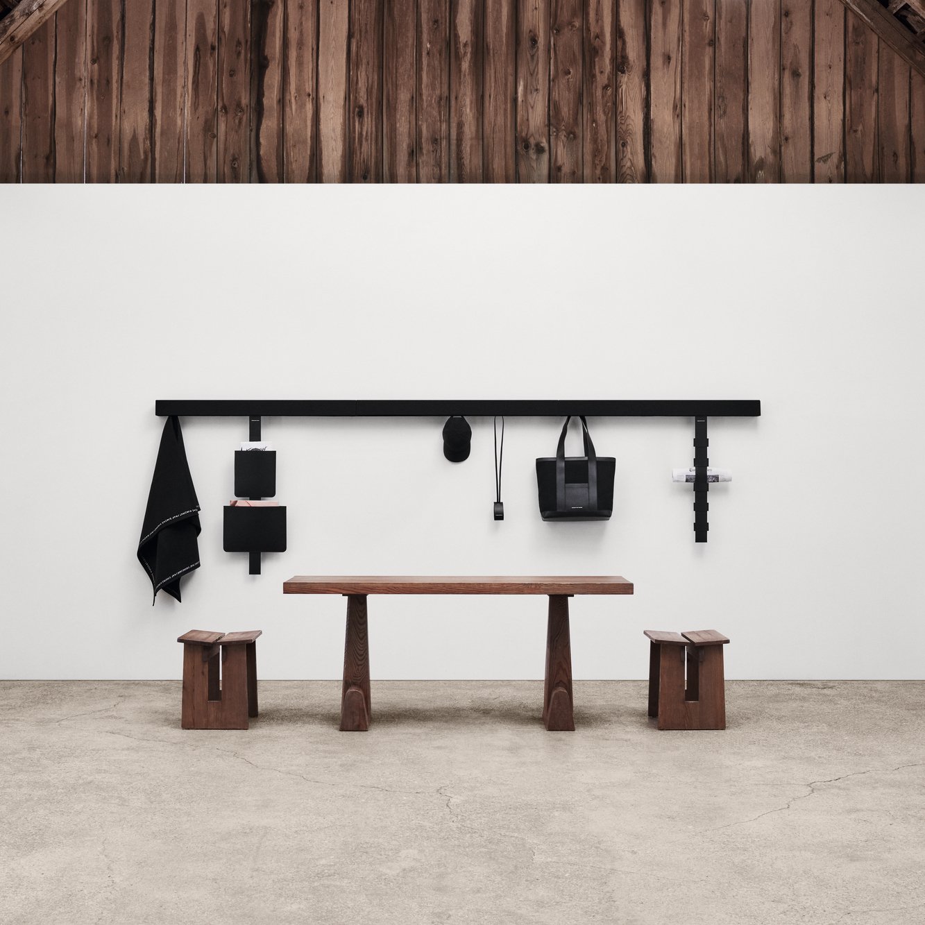 本コレクションでは、現代の暮らしをリセットし、一定の秩序から新しい美を創造するという考えをベースに、清貧さを追求しながら、家具や生活道具を自らの手でつくってきたシェーカー教徒の生活様式に注目。椅子や掃除道具、衣服などを、 ペグレールと呼ばれる壁掛けフックに吊るしていた彼らの風習から発想を展開していった。シンプルなバーの内側に隠されたフックと、それに吊るして収納できるキーチェーン、キャップ、トートバッグ、スロー、クッション、スリーブなどが誕生した。