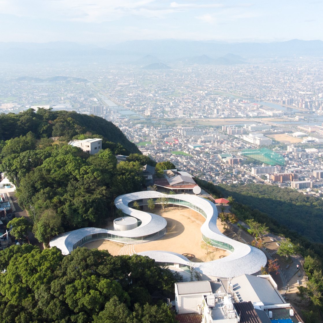 設計を手がけたのは、著名建築家を輩出しているSANAA(サナア)出身の周防貴之。最優秀者に選出されたプロポーザルコンペで提案したのは、周辺環境との関係を重視し、場所の魅力を最大化する“地形のような建築”だ。全長200mにおよぶガラス張りのスロープが大小6つの屋外広場を縫うように配置され、それらが展望スペースや展示室、多目的ホール、カフェなどの用途に合わせて大きく膨らんだり狭まったりしながら、高低差のある地形に沿うように立体的につながっている。ガラス張りの遊歩道のような空間をたどれば、周囲の自然や瀬戸内に浮かぶ島々などの風景と出合い、建築を通してこの地域の魅力を再発見することができる。