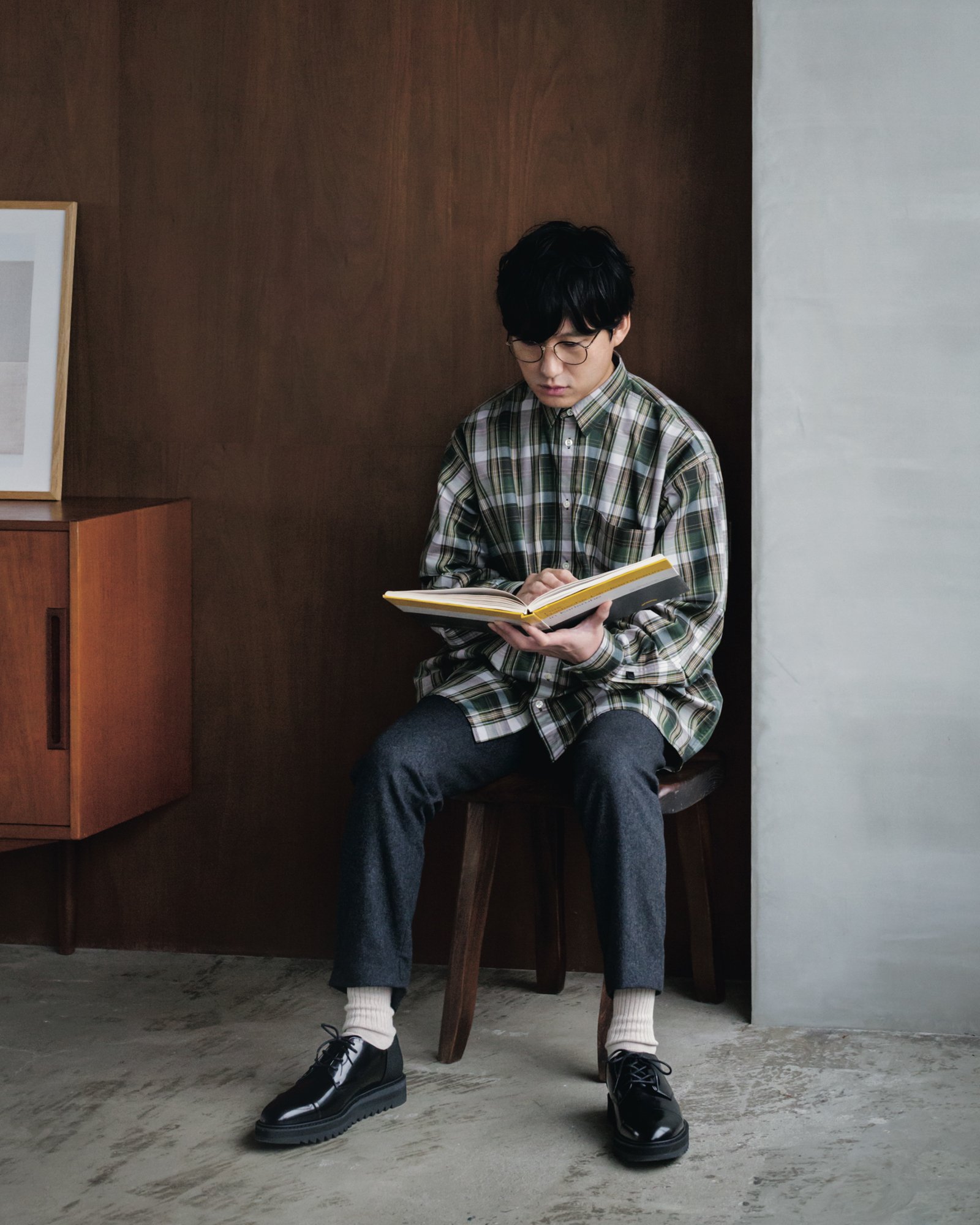バンドやソロでの活動のほか、アーティストへの楽曲提供や編曲・プロデュースに加え、映画音楽、アニメーション音楽、CM音楽などを幅広く手がける江﨑文武。やわらかなシルエットをミニマルなモノトーンでまとめたコーディネートに、「ダービー」を合わせてくれた。これまでは音楽活動ばかりに情熱を注いできたという彼だが、コロナ禍で外出もままならない状況が続くなかで、改めて自分の身の回りのものに意識を向けるようになったという。