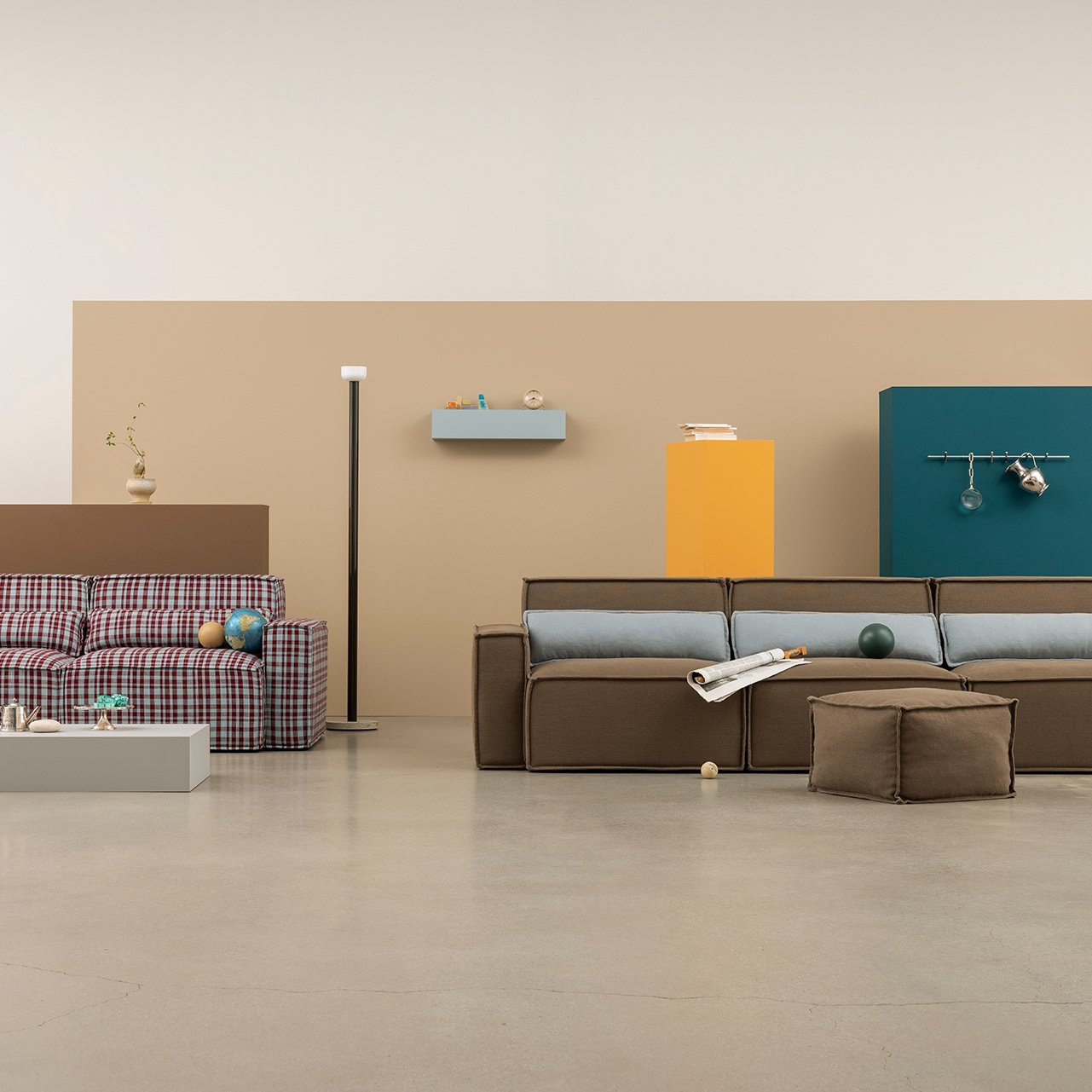 ユニットは、座面と背面だけのシングルタイプから左右の肘付き、座面の奥行きが長いカウチ、コーナー、オットマンなど全11種類。すべてカバーリング仕様で、生地はスペインのガストンダニエラやイギリスのヴィラノヴァといった、品質に定評のある海外ブランドから約120色が揃う。組み合わせ次第で、インテリアの個性を発揮できる。