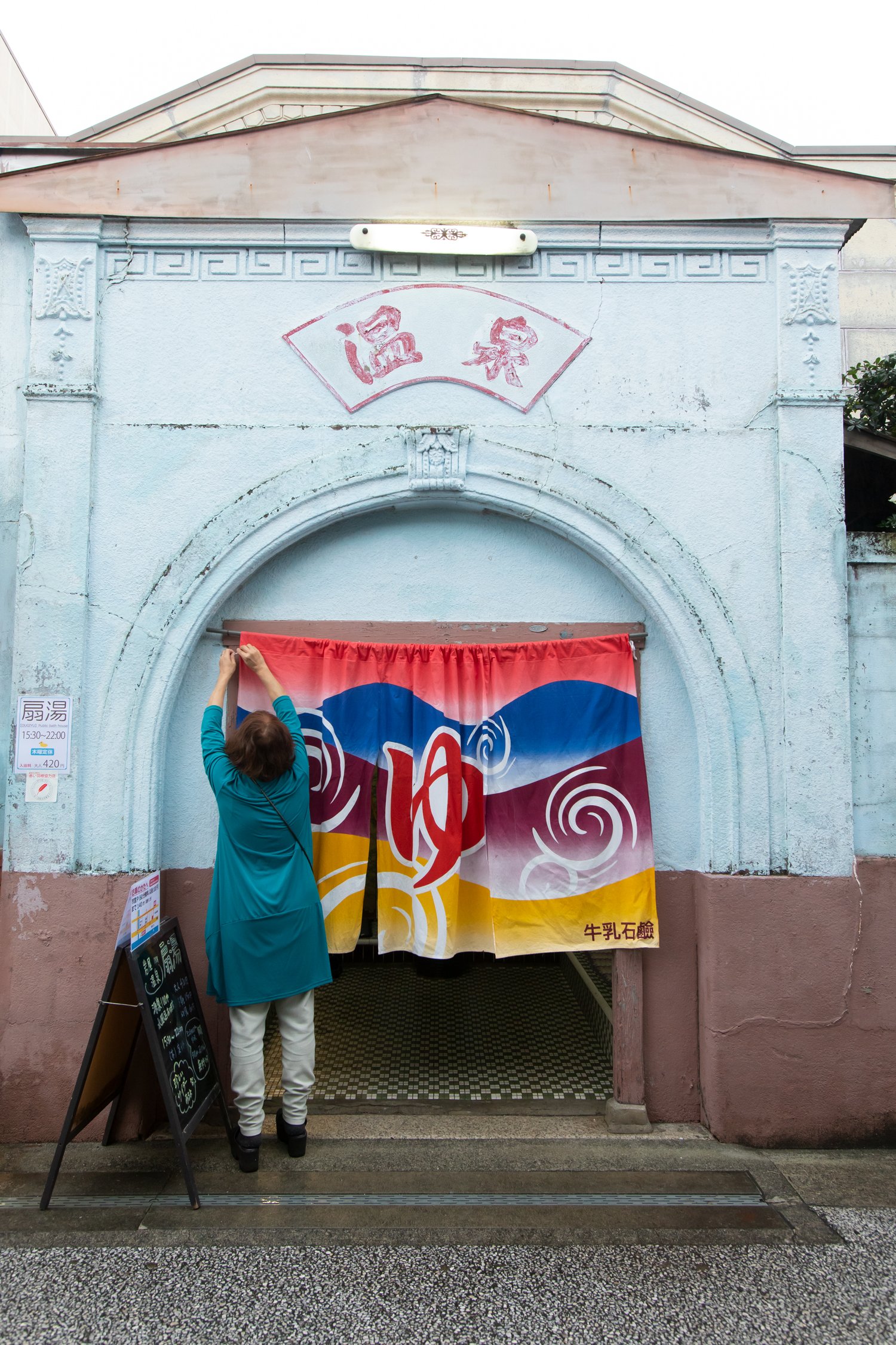 「このカタチは、日本中探しても扇湯でしか見たことがありません。まさに歴史遺産ですよね。僕がこういう趣向になったきっかけは年くらい前に鹿児島の指宿でふと入った弥次ヶ湯温泉。その小さな風呂屋に心を撃ち抜かれ、そんな風情の残る銭湯を巡るようになったのです。でも僕にとって世界遺産のような風呂屋が次々に廃業している。これは大変なことが起きていると思っていまの活動を始め、いまに至ります。岩屋の街にこの風呂が存在してくれることが嬉しいんです」