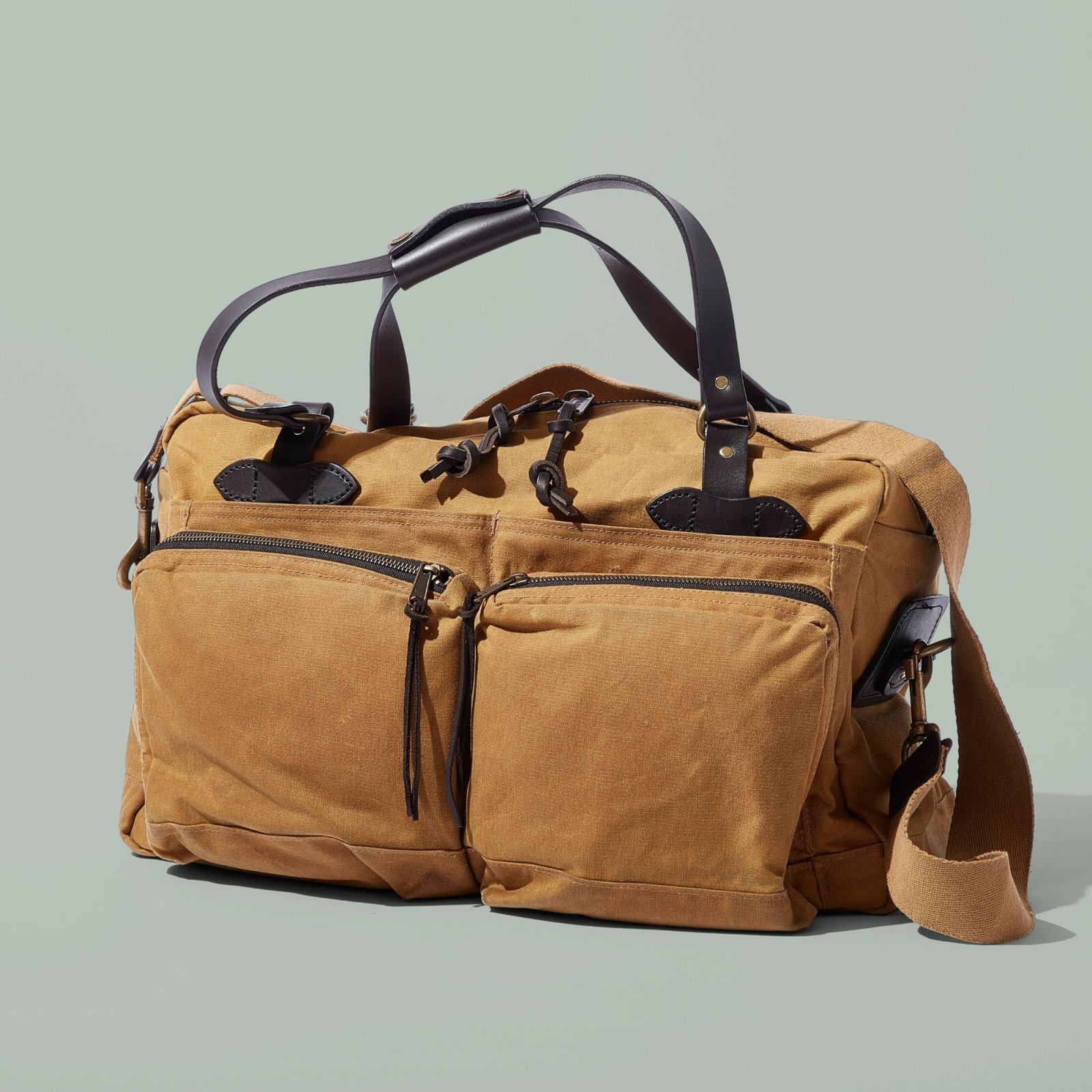 フィルソンは容量や目的に合わせていくつかのダッフルバッグを揃えているが、今回特にスポットを当てたのが「48-HOUR TIN CLOTH DUFFLE BAG 」と呼ばれるモデル。名前の通り、48時間=2日間程度の旅行に最適なようにデザインされている。素材に使われているのは、オイル仕上げの「ティンクロス」。この素材はティン=錫が頑丈さの代名詞だったころに命名された素材だ。上質なコットンだけを丹念に織り込むことで耐久性をアップし、その上にワックスを施して撥水・防風性を高めたフィルソンの独自素材。ハンドルなどに使われているのは、アメリカで最古にして最上のタンナーとして知られる「Wickett & Craig」社で鞣されたブライドルレザーだ。威風堂々とした佇まいにフィルソンの確かな歴史を感じる。