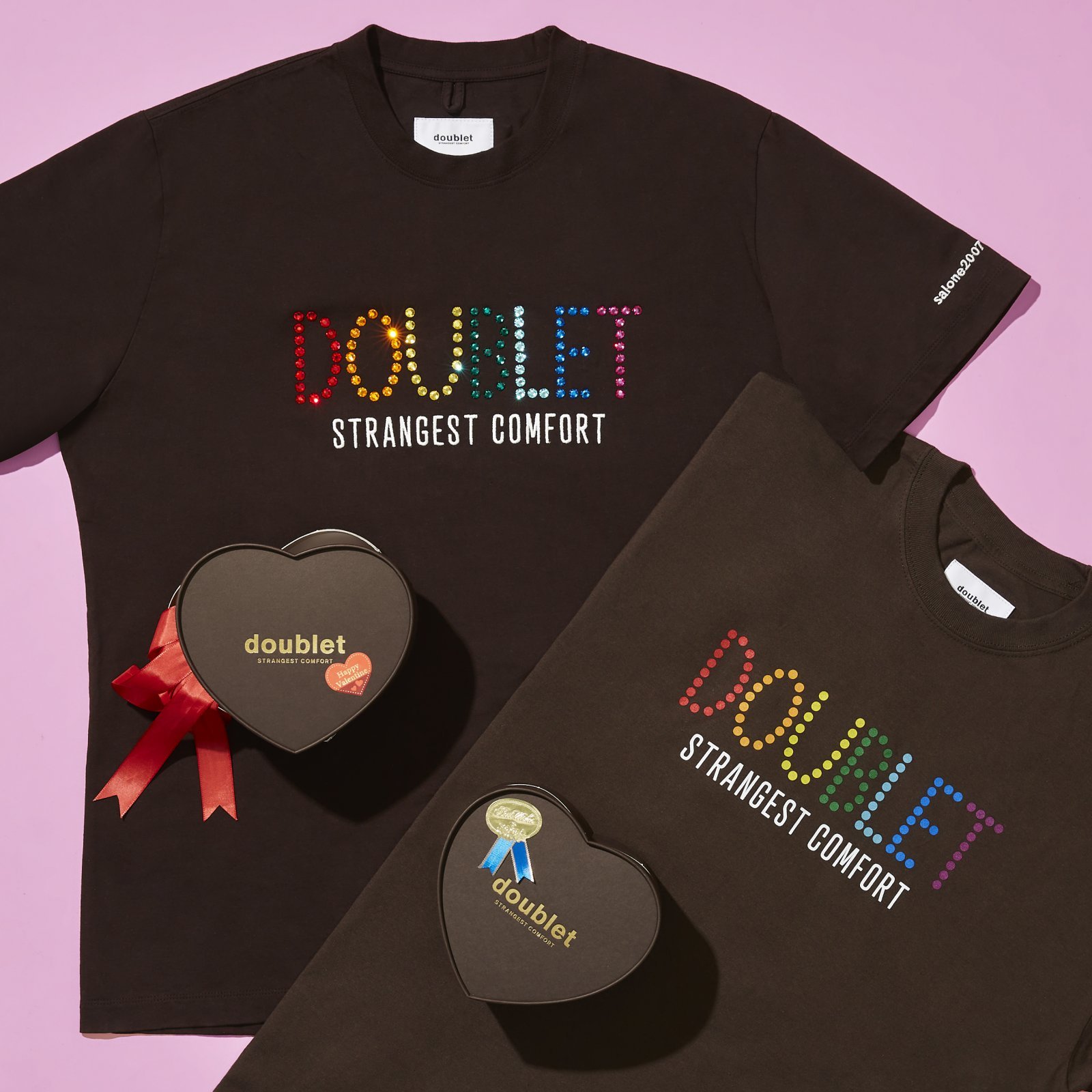 ダブレットでは、オリジナルボディにクリスタルと刺繍でロゴがデザインされた本命Tシャツと、既成ボディにプリントでロゴデザインがあしらわれた義理Tシャツを用意。それぞれのTシャツの左袖には今回のコラボレートを象徴するSALONE2007の店名がデザインされている。今回の限定アイテムのために特別に製作されたギフトボックスにラッピングして販売される予定だ。