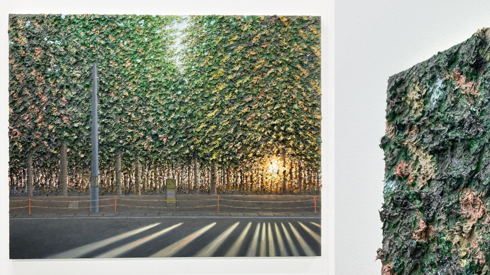 写真ではわかりにくいでしょうが、ジオラマのように盛り上がった立体と、奥に引っ込んだ平面とが混じり合った油彩によるハイブリッドな絵画です。