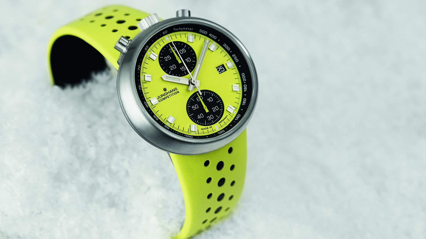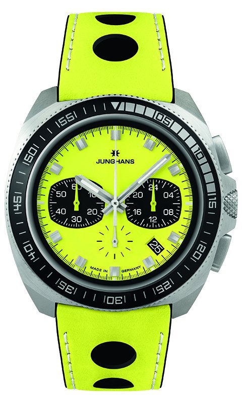 ちなみに、2つのモデル名に冠された「1972」は国際的なスポーツの祭典がドイツ・ミュンヘンで開催された年であり、ユンハンスは公式タイムキーパーを担当してスポーツ計時の新基準を確立した。これを記念して発売された個性的なクロノグラフが半世紀を経た2022年に特別限定として復活。この特別限定モデルはオレンジベースにブラックだったが、今回の記念モデルはレモンイエローをベースカラーとして継承するとともに、新たに同色のクオーツモデルも追加されたという経緯になる。