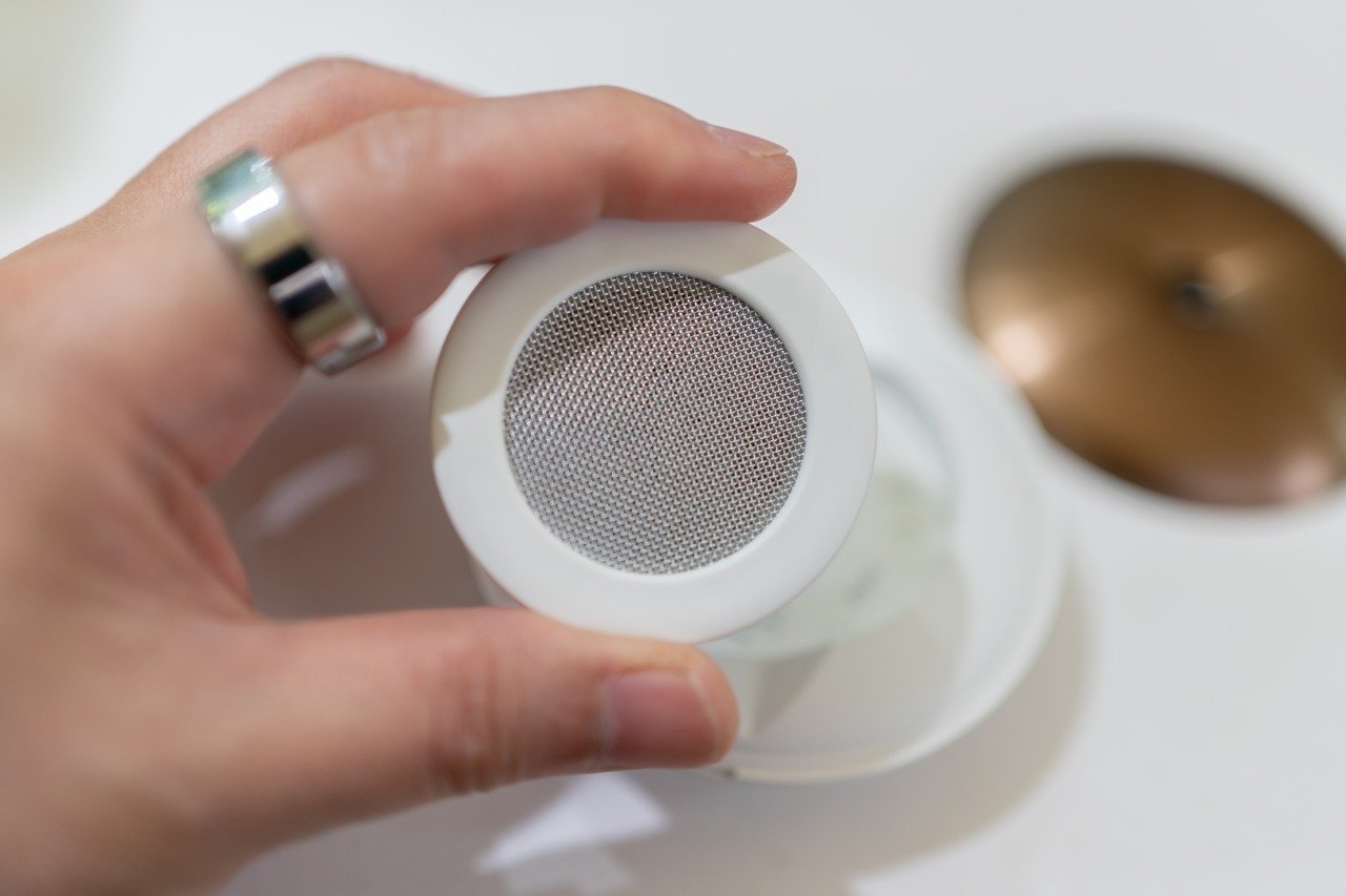 小型のアロマディフューザーでは、空気圧でオイルをミスト状にして噴霧するネプライザー式のものが多いが、ラバロックはファンで香りを拡散する送風式を採用。フィルターには、製品名の由来にもなっている溶岩石(ラバロック)を砕いたものを使用しており、気泡が多く表面積の多い溶岩石にアロマオイルを染み込ませることで、コンパクトサイズでは難しかった本格的な芳香力を実現したとのことだ。