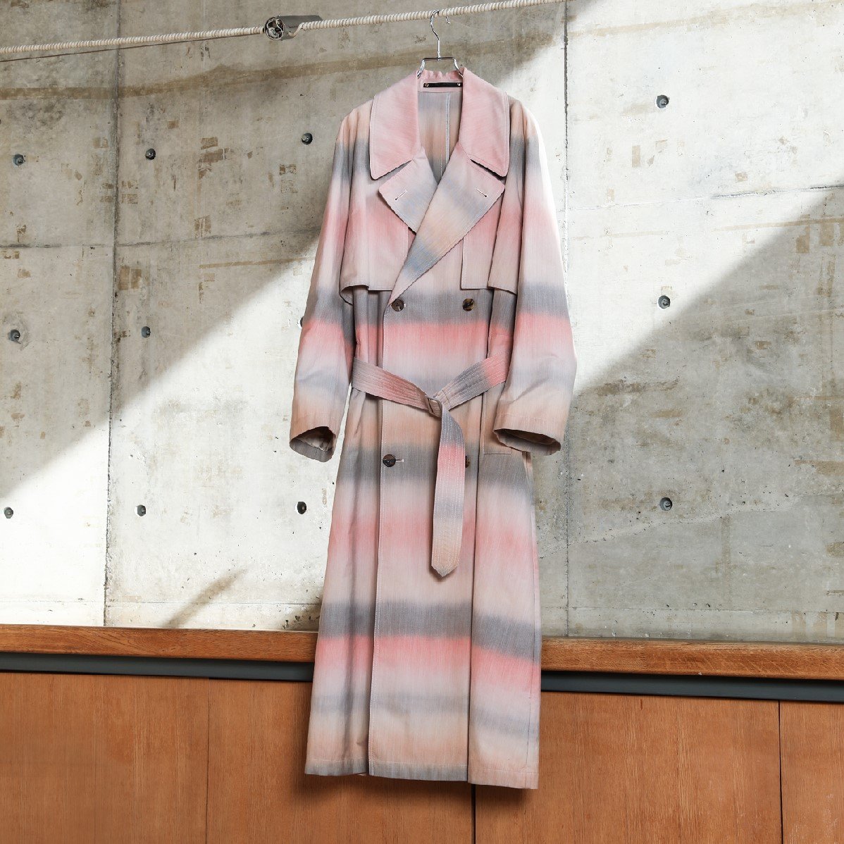 経糸のポリエステルは1本でピンク、ベージュ、ブラック、オレンジのグラデーション染め、緯糸のコットンはベージュの単色染め。先染めで織り上げ、コットン糸はポリエステル糸より太い番手を用い、浮き出るようなストライプを表現した。