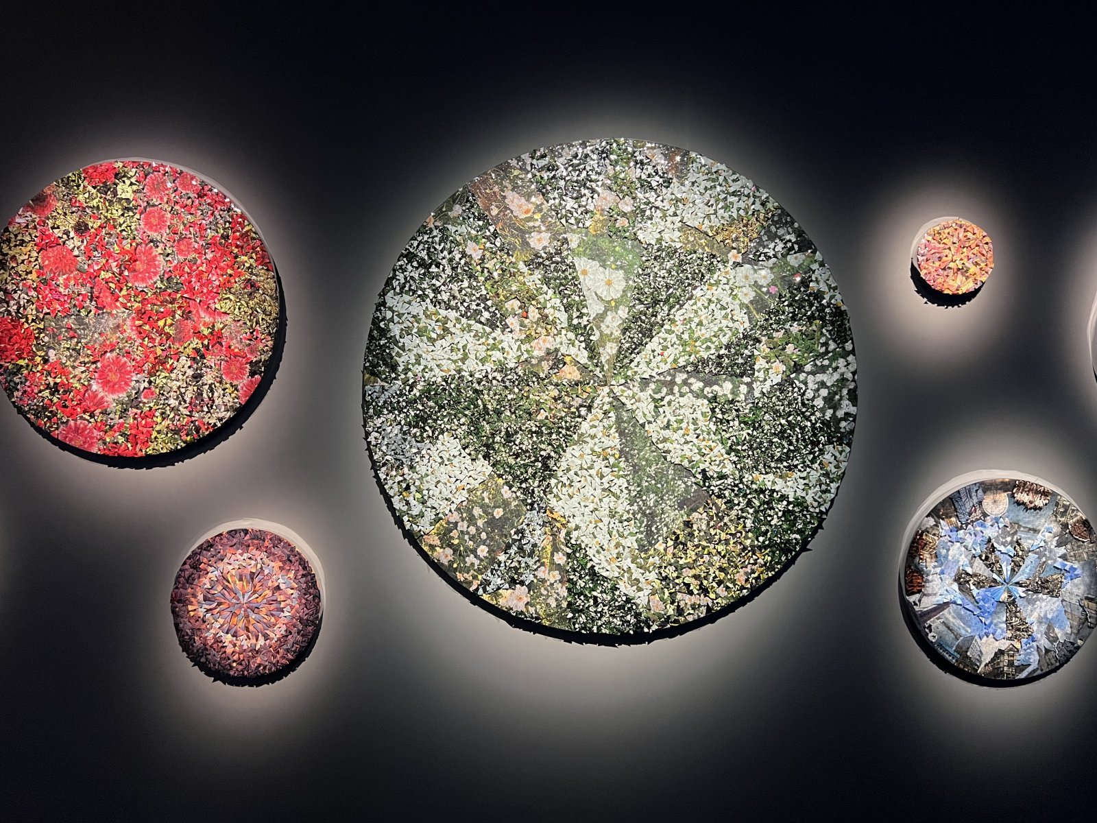 一方で同じ「Homeland」シリーズの『ISLAS』とは、作品の中へ入ることのできる没入型のインスタレーションだ。鏡面に囲まれた空間には無数の小さな鏡と海の写真の断片が糸で吊るされていて、あたかも水の中をかき分けて海の奥底へと誘われるような体験を得ることができる。このほか自身の旅の写真を用いて制作され、7つの円形作品で構成された「Travel Diary」や、存在のはかなさを表現し、ピラミッド状の折り紙でできた「My Autumn」の各シリーズなども展示され、繊細でかつ詩情を感じさせるポブレットの作品世界を味わえる。展示室の中へ鏡面を大胆に取り込むことで、作品同士が映り込みながら響き合うような構成も魅力だ。