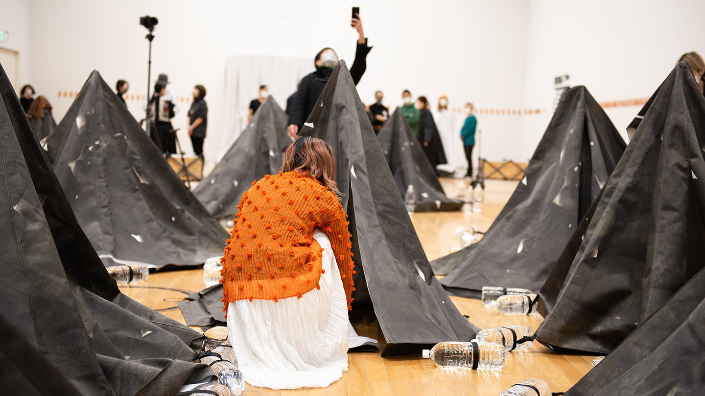 会場に入ると、並んでいる椅子にQRコードを記したシートが置かれており、そこにいる人のほとんどが白いマントのようなものを着ている。QRコードを読み取ると、音声データへと導かれる。女性と男性のひそひそ話が聞こえてくる。「いまから、いくつかのルールをあなたに伝える」という女性と、「それはできない」という男性の声。