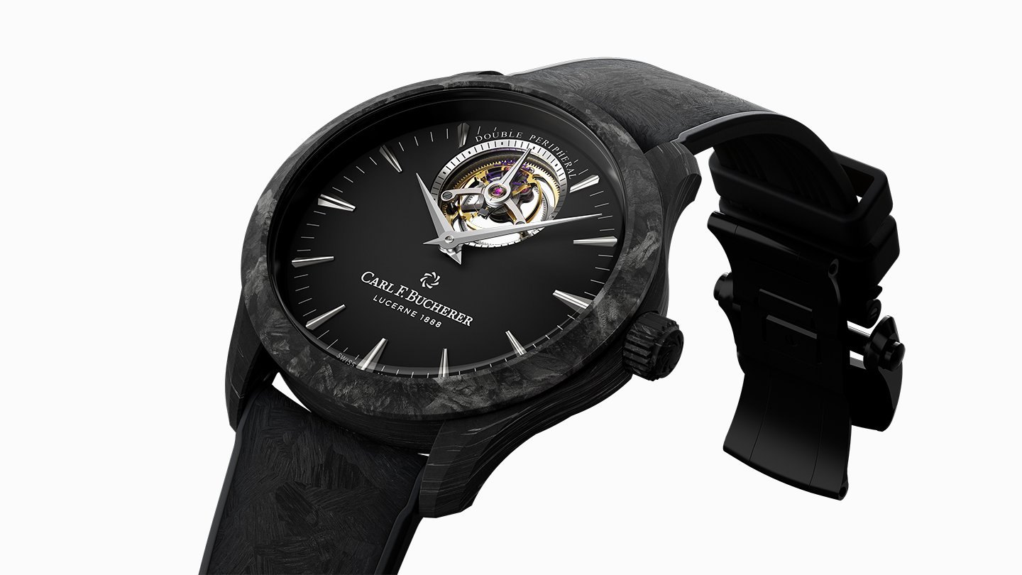 ペリフェラル3タイプのケースは、ブランド初の素材であるフォージドカーボン(鍛造炭素)を採用。超軽量で硬度が高く傷がつきにくいほか、ブラックベースの中にモデルによって1本1本が異なるグレーの個性的な模様が見られる。クロノグラフはSSケースだが、こちらも硬度が高く耐傷性に優れたマットブラックのDLC(ダイヤモンドライク・カーボン)でコーティング。自動巻きローターもブラックに塗装されている。それだけでなく、5タイプすべてが異なるテクスチャーのブラックラバーストラップを組み合わせており、これまでになかったクールでスタイリッシュな雰囲気に仕上がっている。