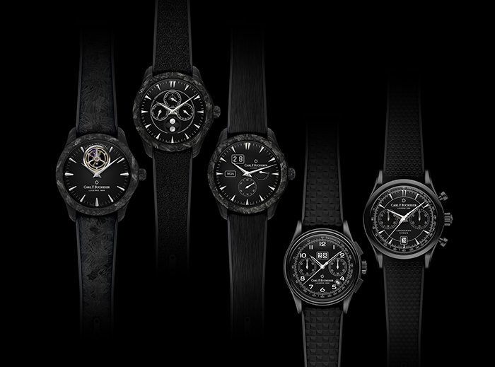 このカプセルコレクションは、前述した「CFBペリフェラルテクノロジー」の搭載モデルとして、トゥールビヨン、パーペチュアルカレンダー、大型の日付表示窓をもつビッグデイトの3タイプをラインナップ。フライバック付きとアニュアルカレンダーを搭載したクロノグラフ2タイプも揃っており、5タイプそれぞれが多彩な質感のブラックカラーを装っていることが際立った特長になっている。