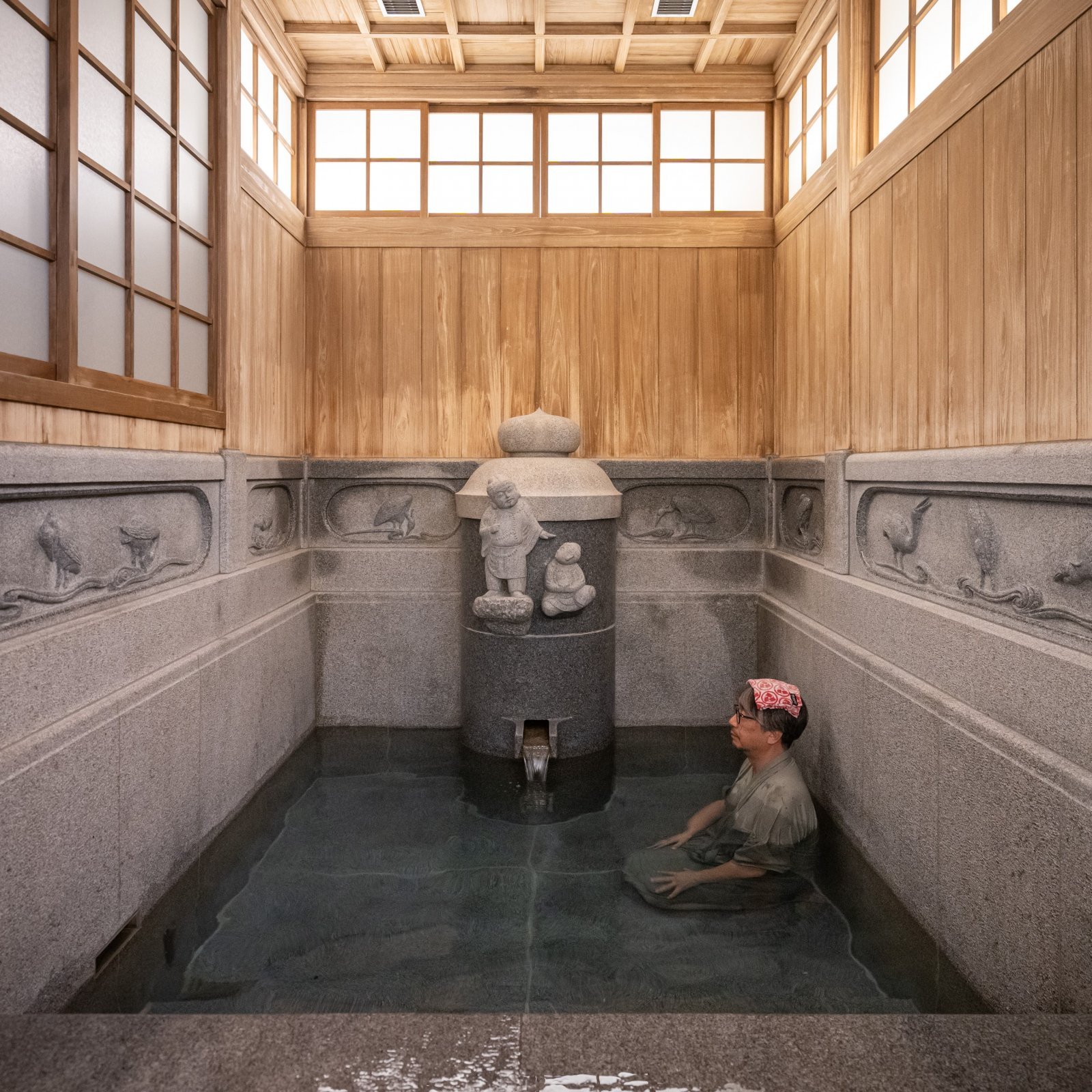 しかしその設えを再現し、一般客も入浴できる浴室が、別館として建てられた「飛鳥乃湯泉」にある。その入浴作法は独特だ。まず、数寄屋造りの絢爛な八畳間で、一定以上の身分の方が入浴のときに着用していた「湯帳(ゆちょう)」と呼ばれる浴衣(よくい)に着替える。襖を開ければ、板の間の先に重厚な石づくりの浴室が! 壁面には道後温泉発祥の伝説にちなむ白鷺のレリーフが刻まれ、天井には天皇ゆかりの文様が描かれている。石段を下り、湯に浸かる。注がれる湯の音だけが茶室のごとく響き、湯帳のゆらぎすら心地よく感じる。