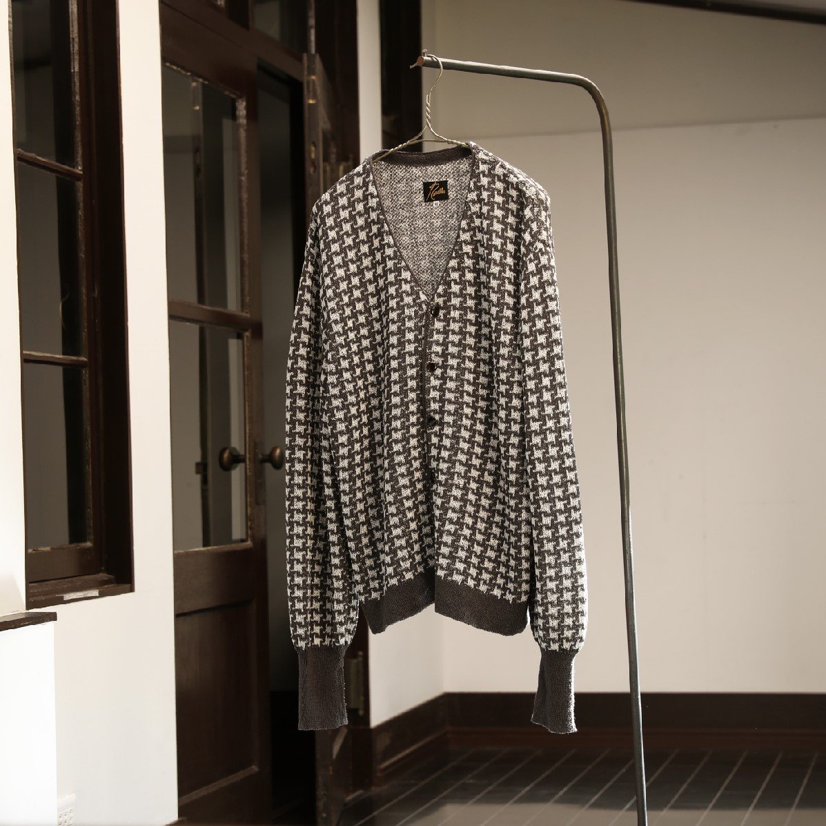 千鳥格子柄が目を引くカーディガンは、和紙とポリエステルの天竺編み。和紙のシャリ感にポリエステルのツヤがマッチし、さらっとした肌触りとふんわりした着心地を実現。凹凸感のある立体的なつくりだが、軽量なので、夏場でも涼しく着用できる。