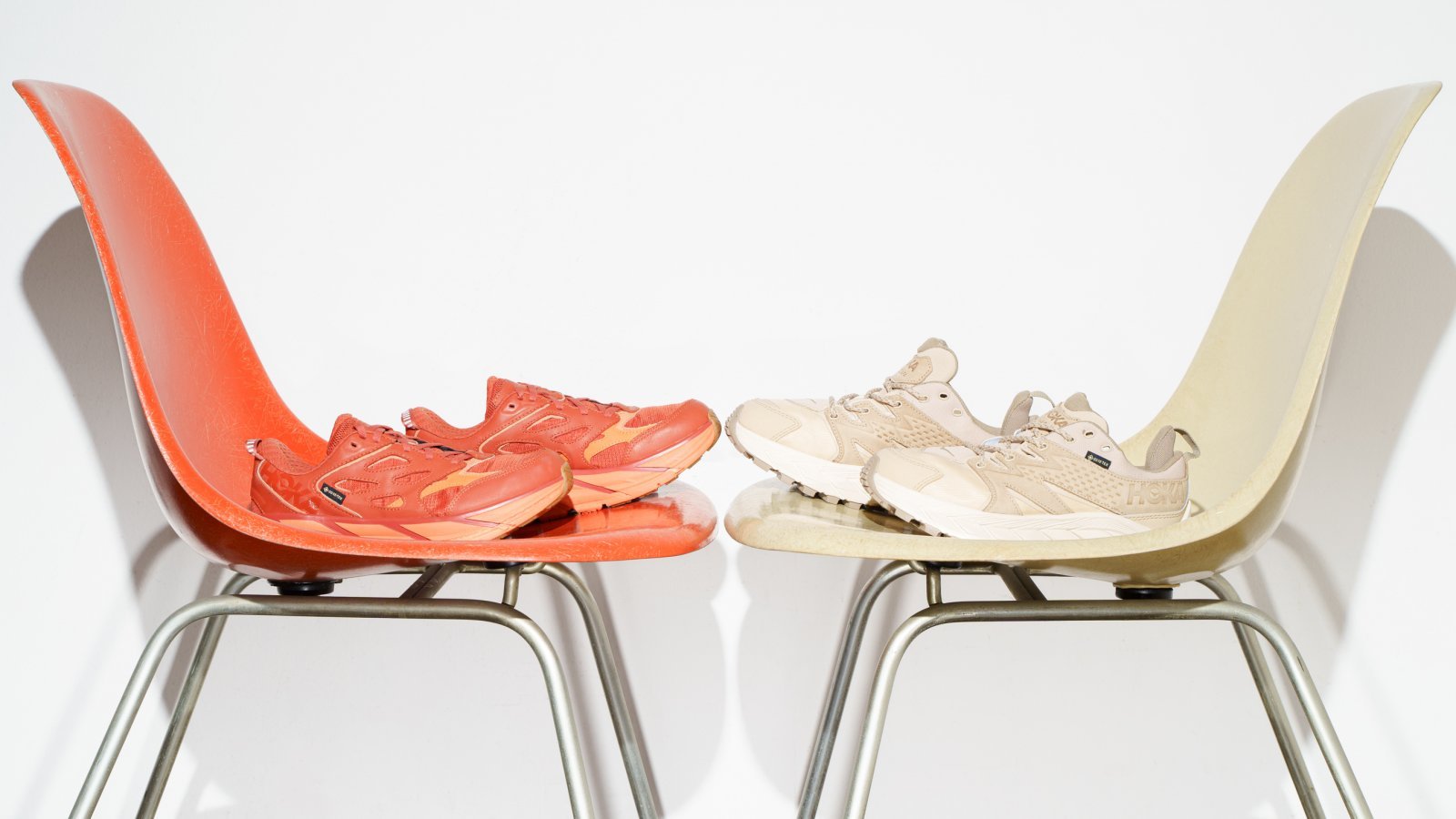 厚底トレイルランのブームを生み出した先駆者のホカ。正式なブランド名はホカ オネオネだが、現在は親しみを感じさせるホカという呼び名になっている。ダッドスニーカー(野暮ったさギリギリのセンス)でもあるホカのデザイン力はファッションブランド級。ここに掲載する2型のうち上写真2点は、春らしいオレンジ系の色でシンプルにまとめられたモデル。カラフルなアイテムを身に着けたい旬の気分にぴったりだ。カーキ色や茶色のアウトドアウエアともよく合うから、日常の服装のアップデートに役立つ。このスタイリッシュな見た目にして、機能は防水ゴアテックス搭載。山を走れるシューズは、街歩きも快適にしてくれる。