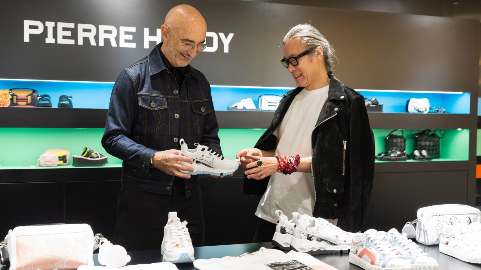 コラボコレクションを記念して東京・GINZA SIXで3月に行われたポップアップストアに、デザイナーのピエール・アルディ(以下、ピエール)と、アーティストの河原シンスケ(以下、シンスケ)が揃って訪れた。いつもにこやかなピエールが、シンスケのシンボルであるうさぎ図案を手に取りさらに笑顔に! 彼が友人とのコレクションに込めた思いを語った。