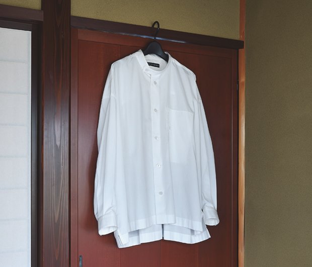 「僕は一度気に入ったらずっと同じようなものを着るタイプなので、白シャツだけでも相当な数をもっています。デザインにどこかヒネリのあるコレクションブランドのものが多くて、なかでも特に気に入っているのが、イッセイ ミヤケ メンのスタンドカラーシャツです。これは6年ぐらい前に買ったもので、汚さないように大事に使っています」