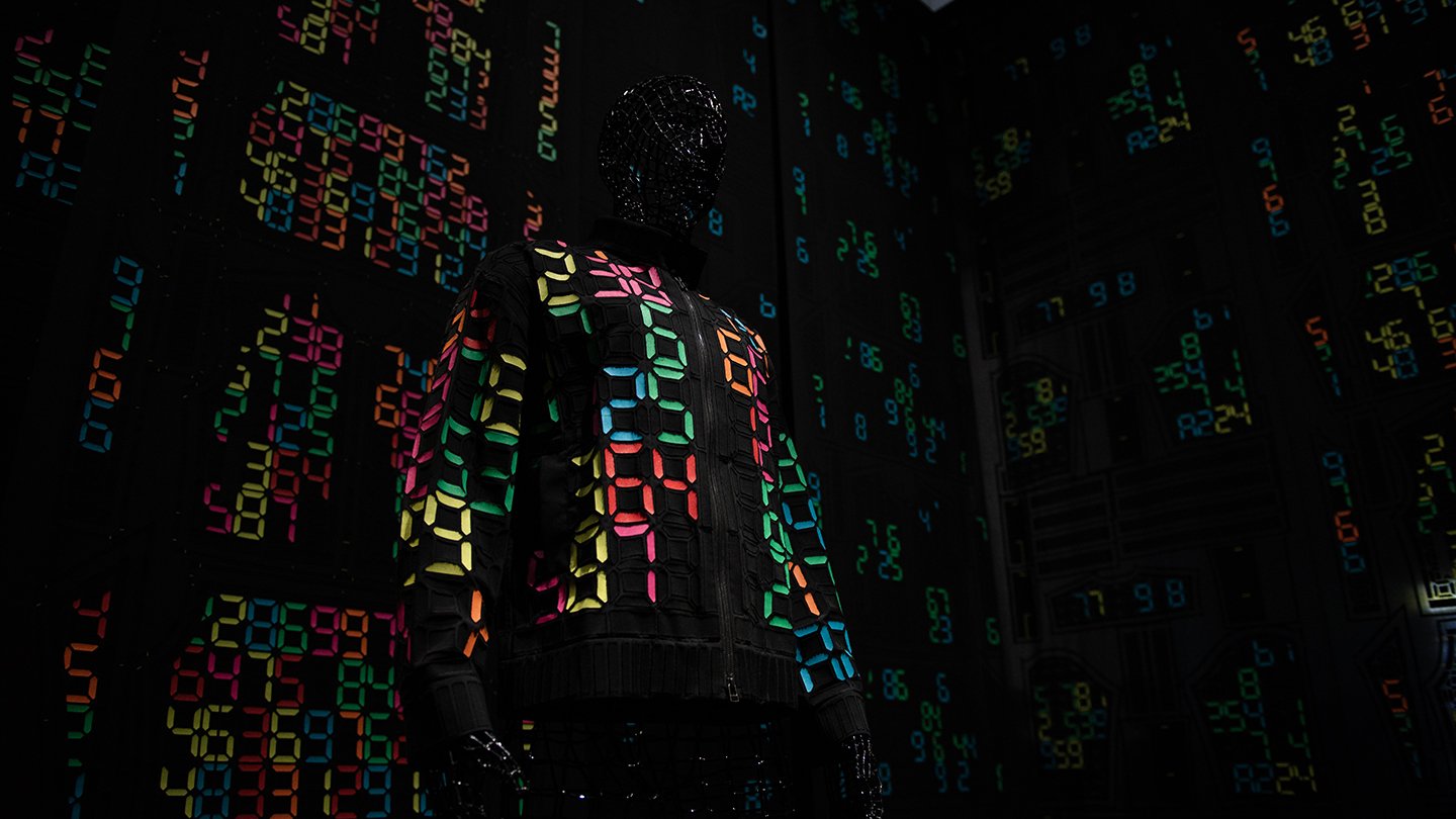 A-POC ABLE ISSEY MIYAKEの宮前義之は、三宅一生から「一枚の布」で完成させる服作りの理念を受け継ぎ、京都の伝統的な技術と宮島達男の「時間」や「生命」の表現をブルゾンに込めた。最後の展示室に展開するのは、ニューヨーク在住のデザイナー、田村奈穂がヴェネツィアのガラス工房WonderGlass社とともに手がけたインスタレーション作品『FLOW[T]』。海と空の境をなす水平線をモチーフに、長く受け継がれてきた吹きガラスの技術によって、ものにあふれる現在に求められるものづくりのあり方をガラスの風景で提示する。