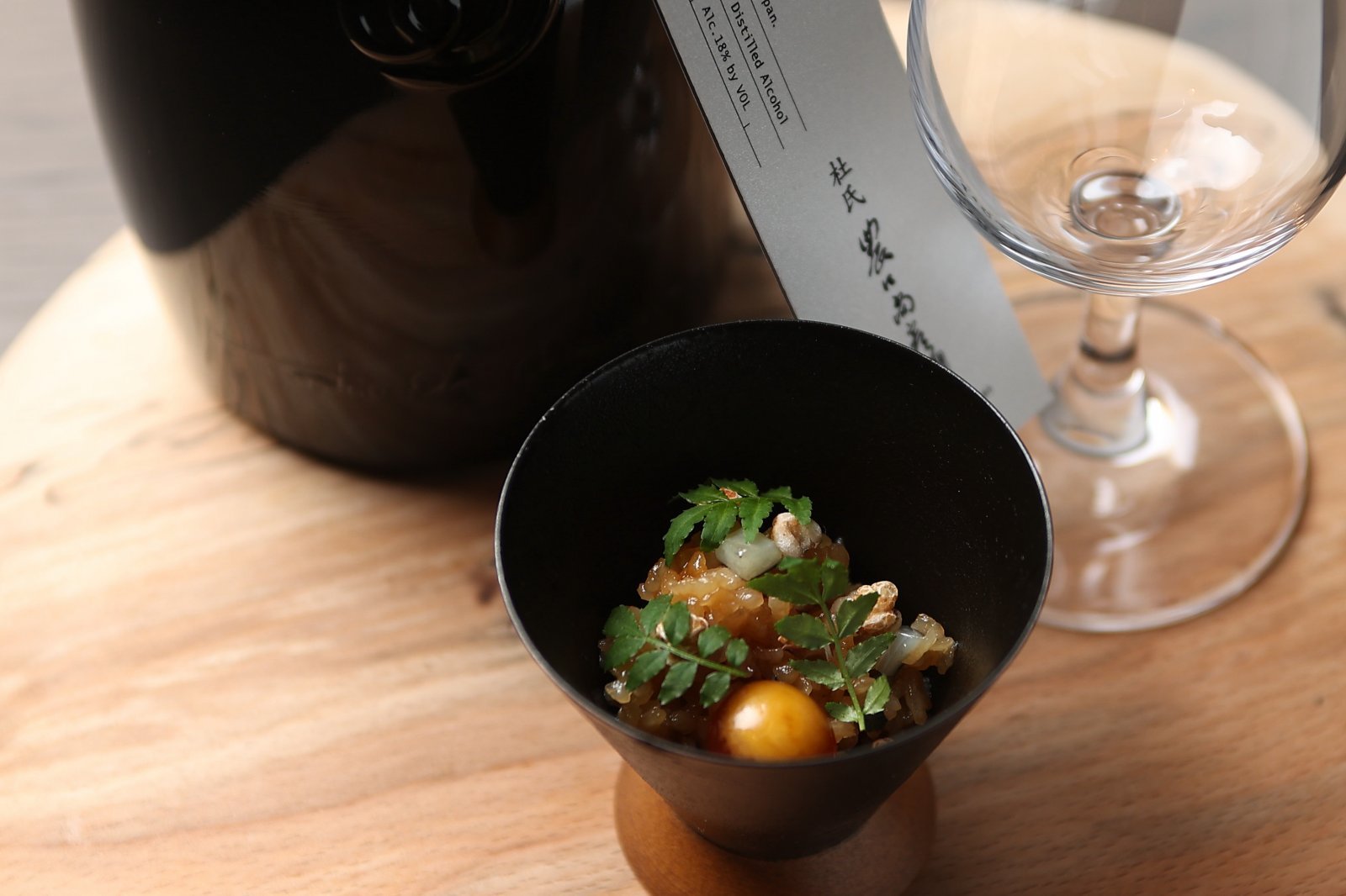 石川県白山市で育てられた仔羊をシンプルに薪焼きにしたものと、同じく仔羊のミンチをほうれん草の生地で巻いたタコス。ペアリングは、しぼりたての新鮮な酒粕を減圧蒸留し、吟醸酒の香りと米の旨みが凝縮された農口尚彦研究所の酒粕焼酎を、前日のうちに仕込水で1対1で前割りして馴染ませた水割りに、氷を浮かべて提供。対照的なペアリングとして、山廃愛山の45℃の上燗も同時に提供された。