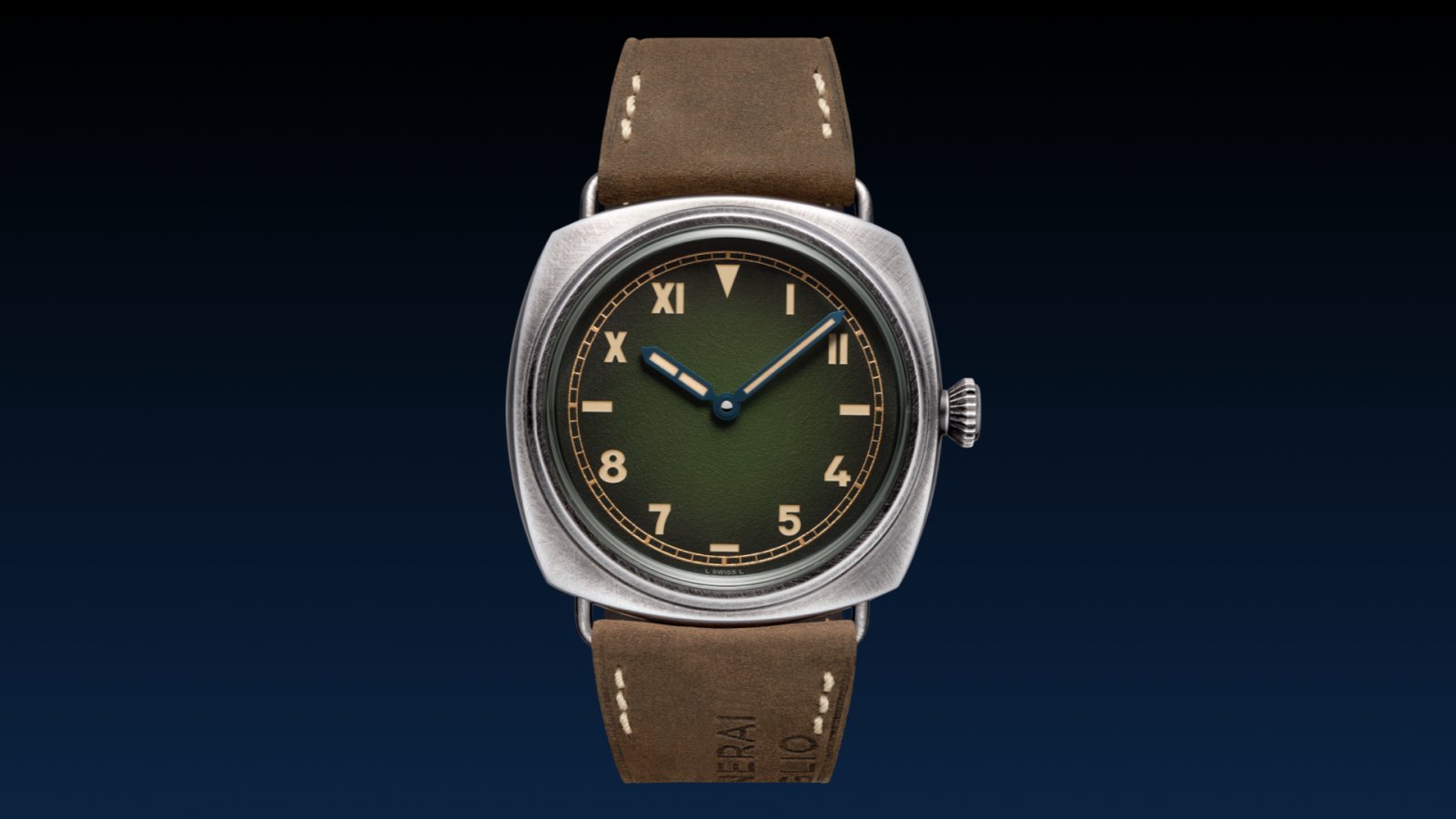 ヴィンテージ感の濃厚なグラデーショングリーンダイヤルを採用。ローマ数字とアラビア数字、バーインデックスが交錯する“カリフォルニアダイヤル”は、ベージュカラーのインデックスの蓄光が、暗闇ではグリーンに光る。メタリックブルーの針、プレキシガラス風のドーム型サファイヤ風防、円錐形リューズもクラシックな雰囲気を演出。極め付けは、PVDで経年変化したような外観に仕上げた「ブルニートeスティール」のクッション型ケースの味わいだ。