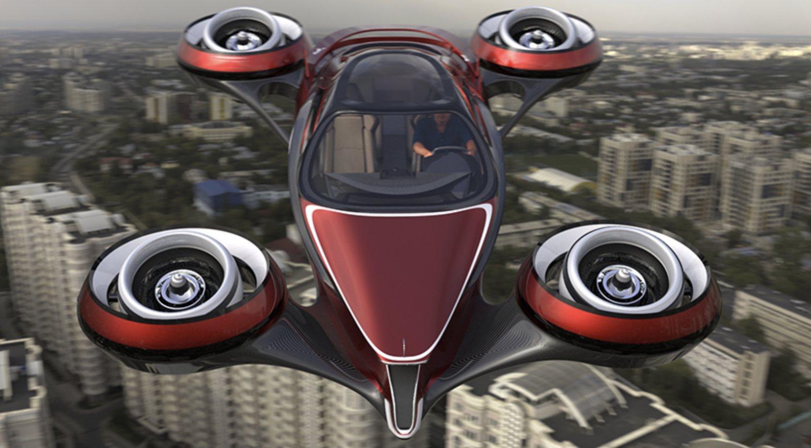 これに乗れば、4基のジェットエンジンで地上を離れ、交通渋滞に巻き込まれることもない。未来感覚の小型ボディーは、長さ6メートル。パイロットを含めて4人が搭乗できる。