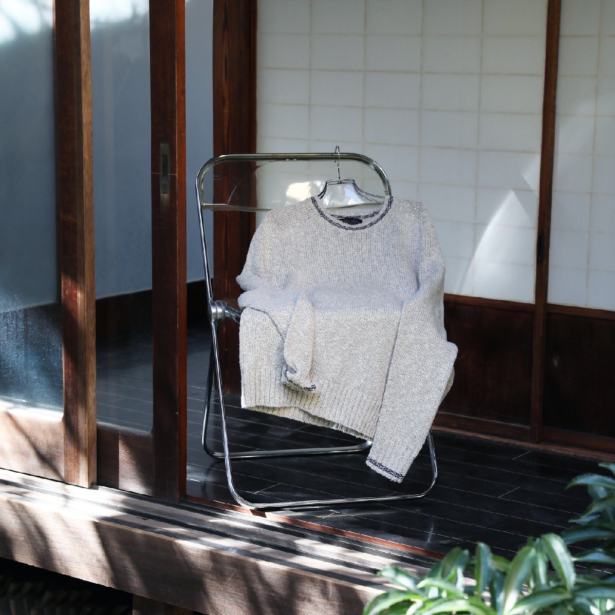 Tシャツ1枚だとまだ朝夕は心細い、そんな時期にお薦めしたいのがリネン混のコットンニットだ。サラッとした質感に優しげな印象を与えてくれる。