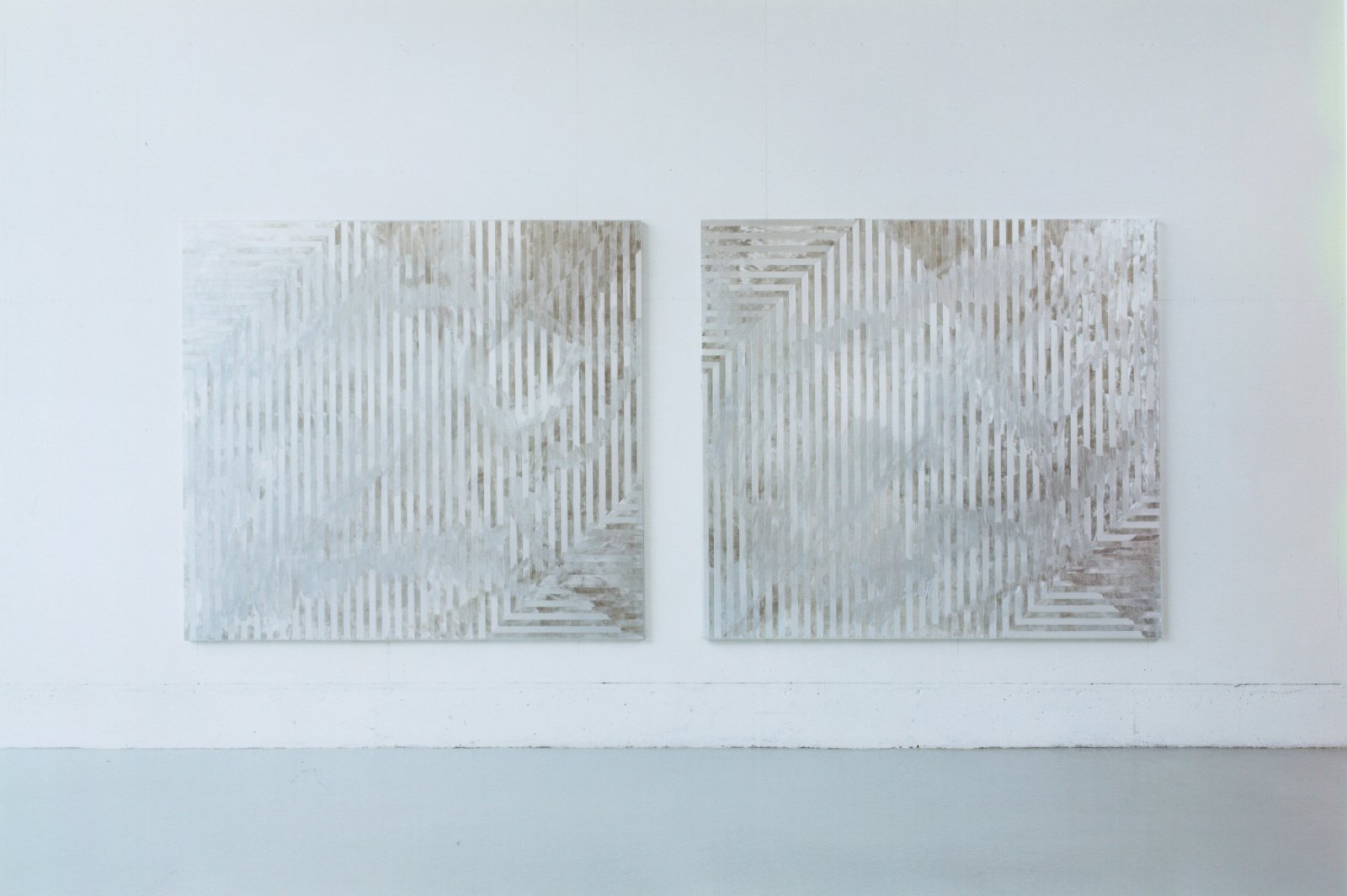 一見ミニマルで無機質な作品だが、よく見ると絵画の表面には刷毛跡とともに細かな傷がつけられていたり、マット加工をした部分と意図的に光らせた部分をランダムに配置していたり。作品を見る位置や展示空間の光の入り方によって、表情が変わる複雑性を忍ばせている。