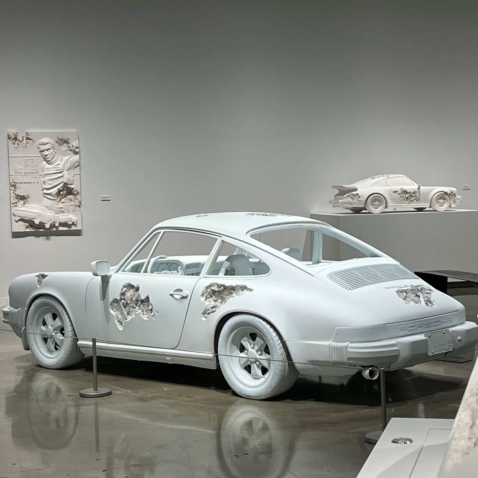 車体に大胆な穴を空け水晶などの天然石で「eroded(風化)」加工を施した1961年型フェラーリ250GTや1968年型マスタングGTモデル、2年かけて原板を露出させアマニ油を施し、藍染のボロ布やデニムなどで侘び寂びを表現した1955年型ポルシェ356スピードスターなどが並ぶ。クルマやポップカルチャーが象徴するもの、時間の流れとその意義を追求しているという。クルマと考古学を愛するアーシャムならではの世界観が楽しめる。