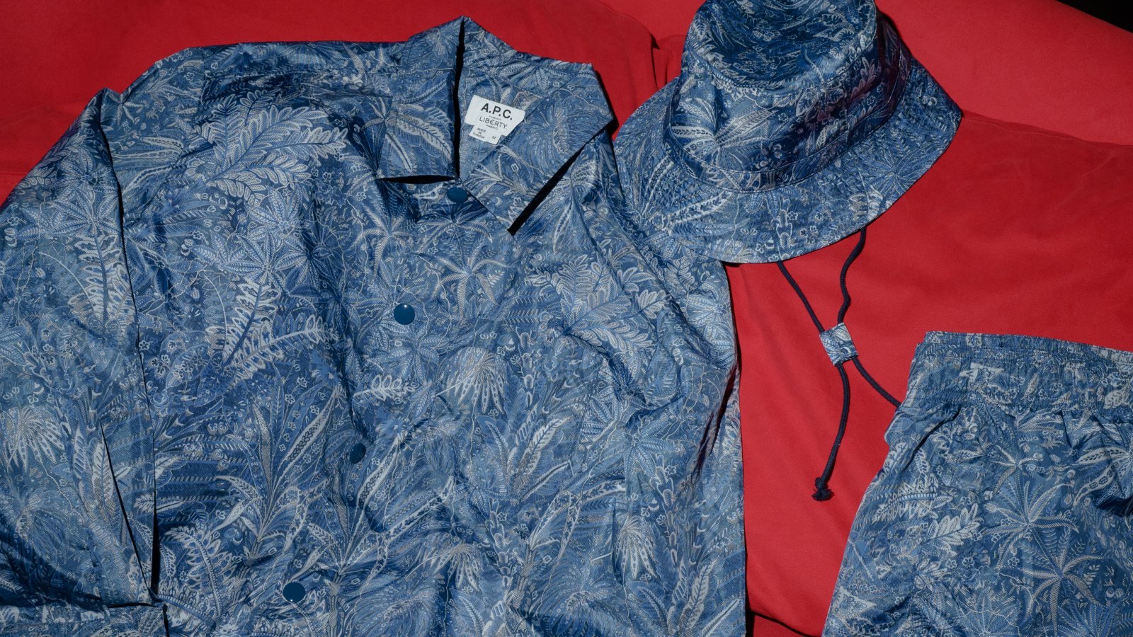 ブルーのワントーンで表現された、植物が絡み合う細密な絵。光沢生地はさりげなく色気も感じさせる。アイテム自体はごくシンプルなコーチジャケットだ。ストリートな日常とアートがひとつになったボタニカル服である。実はこの生地がイギリスのリバティ(Liberty)社によるものと知ると、クオリティの高さに納得がいくのでは?ボタニカルプリントの世界的権威が参加したアイテムなのである。フランスのA.P.C.(アー・ペー・セー)とリバティとのコラボシリーズの同ジャケットは、この春夏の限定アイテム。暑い季節でも肌寒い野外へのドライブなどで大活躍しそうだ。