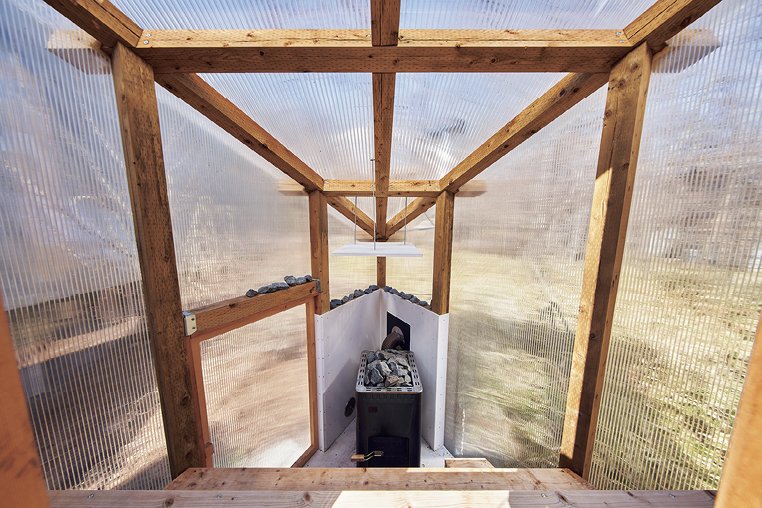 「サンカクサウナ」という名のサウナ小屋。こちらは平面と屋根が三角形。屋根と壁はポリカーボネイト製で外と中の様子があいまいに溶け合う。扉はふたつ備えられていて、ひとつはサウナストーンに水をかけロウリュウをする、茶席でいうところの亭主が出入りする扉。ゲストは茶室のにじり口のような扉を使って出入りする。