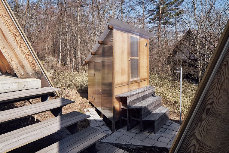 「サンカク」と名付けられた大小ふたつの正三角形の建物。設計はクマさんの母の篠原聡子さんが主宰する空間研究所。篠原さんが中心ではあるが、建築家一家全員でアイデアを出し合ってアップデートしているそうだ。クマさんがこのセカンドハウスで設計したのが、屋外に建てられたサウナ小屋。