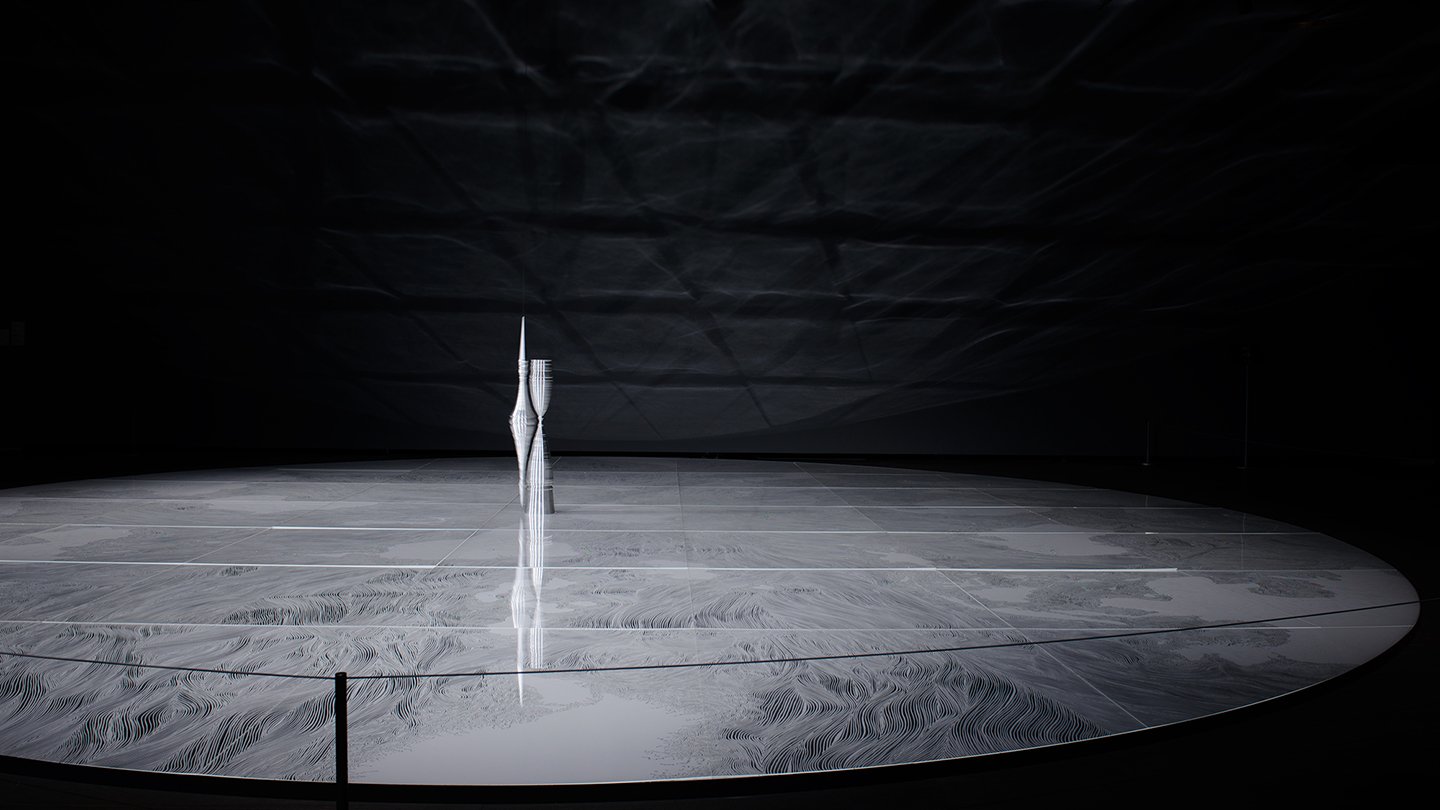 青森のリサーチを通じて感じた、自然の限界的な風景に幻想を求めた古代の夢と、人工的なエネルギー開発で思い描く未来への希望を表現したこの作品。発想の出発点に秦の始皇帝の伝説が存在するが、展示室2階のインスタレーション『Liminal Air -core- 天 IWAKI』『Liminal Air -core- 地 IWAKI』も、岩木山の空と大地の風景をモチーフとしながら、『古事記』や『日本書紀』にも記された神話「国産み」からの着想も反映されている。