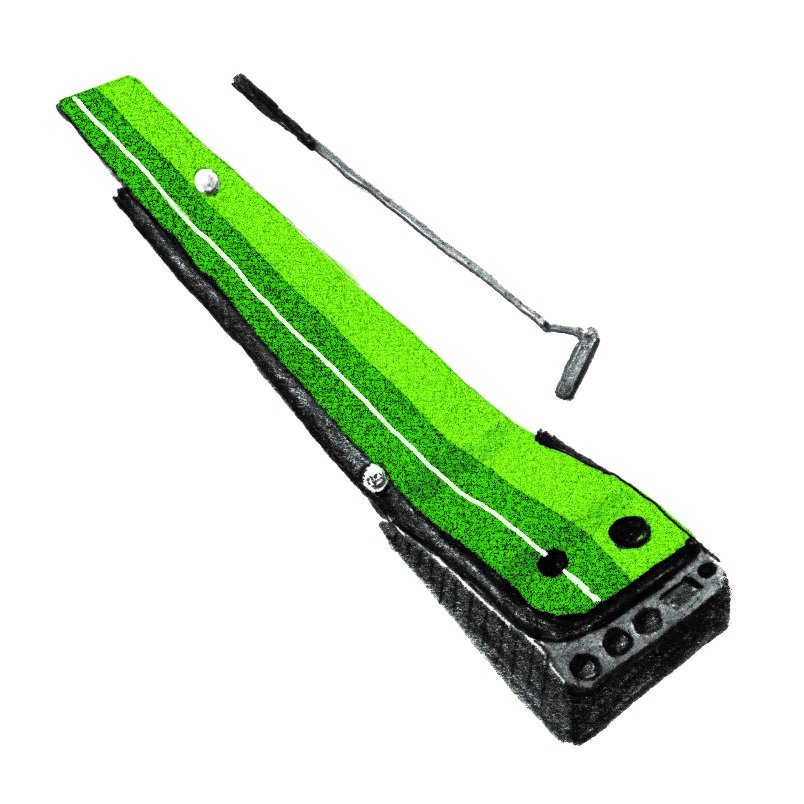 重さの違う2種類の人工芝を採用した、返球機能付きのゴルフマット。自宅で使うこともあるが、閉店後、店内にこれを敷き、酒を飲みながらパターを打つのが至福の時間だ。