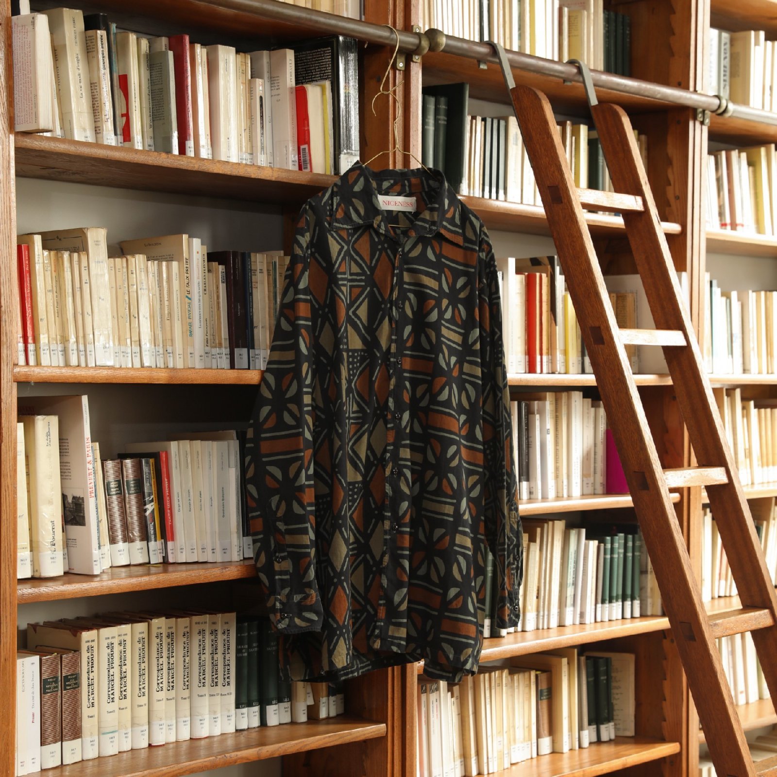 手彫りの木版で布にインクをのせるインドの伝統技術、ブロックプリントによる一着。柄は西アフリカ・マリの伝統的民族布からインスピレーションを得て、現代的にモディファイした独特な幾何学模様。インド綿の特徴であるやわらかな風合いも心地よい。